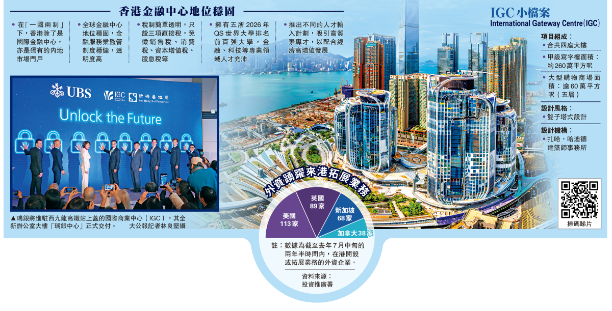 香港金融市場持續蓬勃發展,雙向門戶優勢吸引國際金融機構擴大布局。瑞銀集團昨日(3日)與新地就位於西九龍IGC的「瑞銀中心」(UBS Tower)進行交接,後者將成為瑞銀全新的香港總部,預計今年第四季正式啟用。
