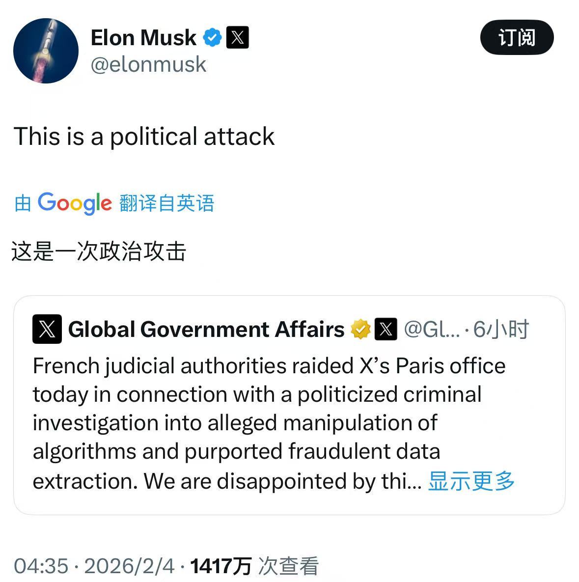 【點新聞報道】當地時間3日,法國巴黎檢察院表示,已對美國企業家埃隆·馬斯克旗下社交媒體平台X位於法國的辦公場所展開搜查。對此,馬斯克在X上回應稱,「這是一場政治攻擊」。他還在另一條帖文中表示,法國應將精力更多放在打擊性犯罪分子上。