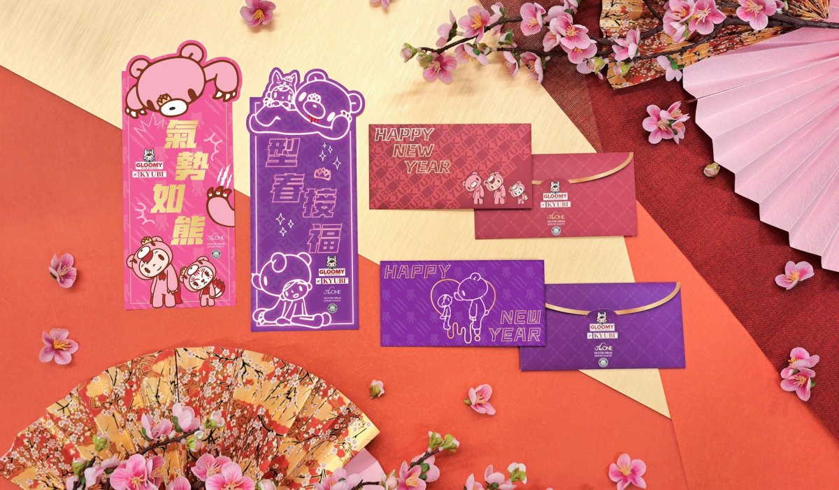 一套兩款的「KYUBI×Gloomy『熊』福齊天」利是封套裝配上紅及紫色系,寓意大「熊」大紫;「KYUBI×Gloomy氣勢如『熊』揮春套裝」有「『型』春接福」及「氣勢如『熊』」兩款,用來裝飾家居旺足一年!
