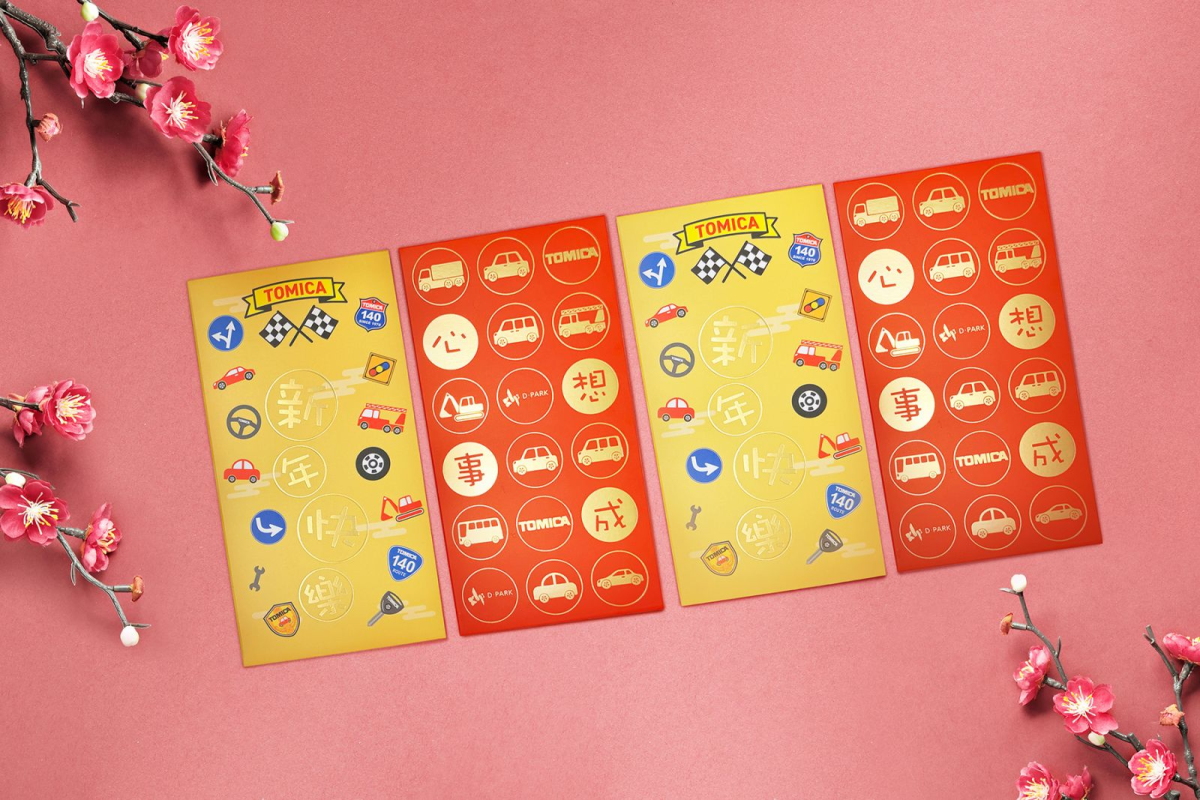 一套兩款的「TOMICA×D·PARK賀年」利是封,封面綴滿各式TOMICA玩具車及品牌標誌,並印有「身體健康」與「心想事成」吉祥祝福語。