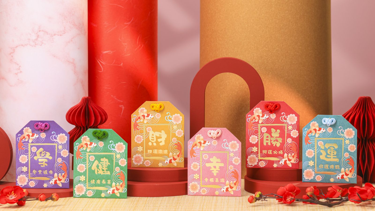 「錦鯉迎春御吉祥」利是封以六種春日色彩:粉紅、暖橙、天藍、雅紫、艷紅、墨綠為主調,各自配上不同祝福句「幸福美滿」、「財運滾滾」、「好運降臨」、「學業進步」、「開運必勝」與「健康長壽」,象徵「六六大順」的吉祥美意。