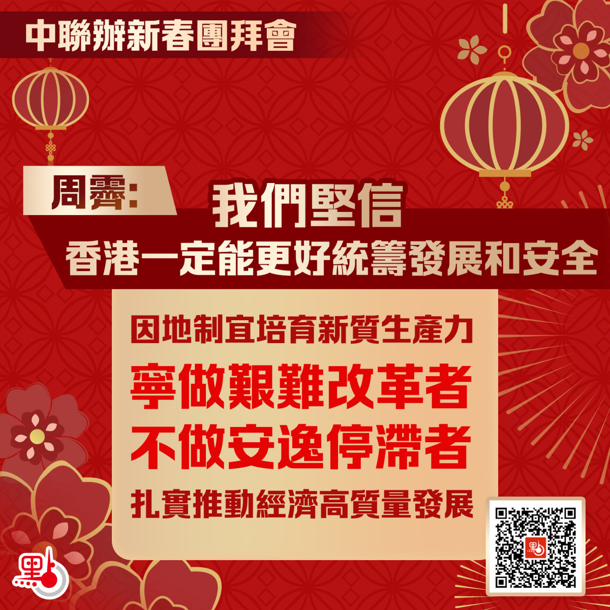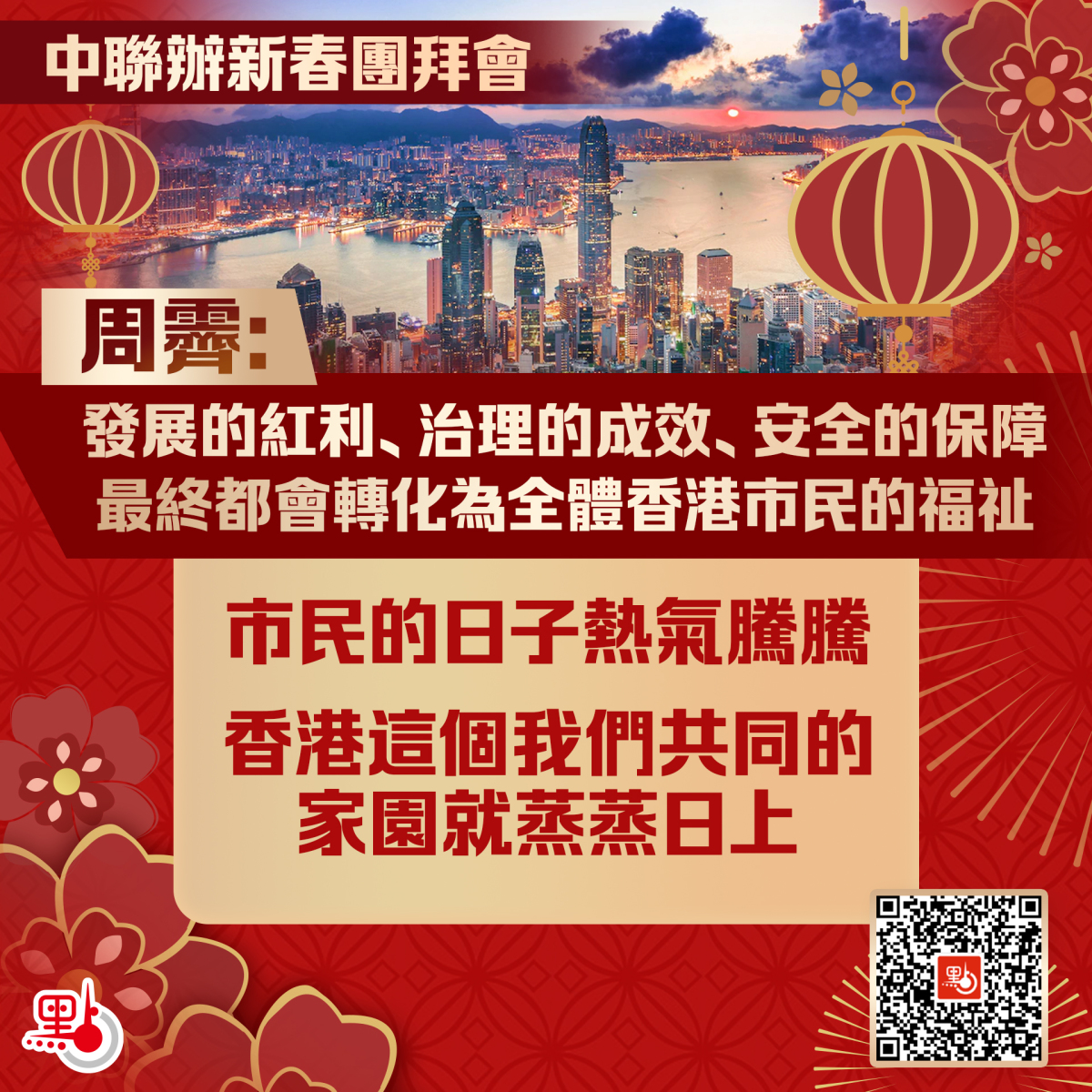 中央政府駐港聯絡辦主任周霽致辭時指出,路雖遠、行則將至,事雖難、做則必成。新的一年,我們相信,香港一定能堅持和完善行政主導,新一屆立法會支持政府不缺位、監督政府不越位,行政與立法良性互動,合力提升特區依法治理效能;一定能主動對接國家「十五五」規劃,深度參與大灣區建設,在融入和服務國家發展大局中,實現香港自身更好發展。我們堅信,香港一定能更好統籌發展和安全,因地制宜培育新質生產力,「寧做艱難改革者,不做安逸停滯者」,扎實推動經濟高質量發展。發展的紅利、治理的成效、安全的保障,最終都會轉化為全體香港市民的共同福祉。市民的日子熱氣騰騰,香港這個我們共同的家園一定能夠蒸蒸日上。