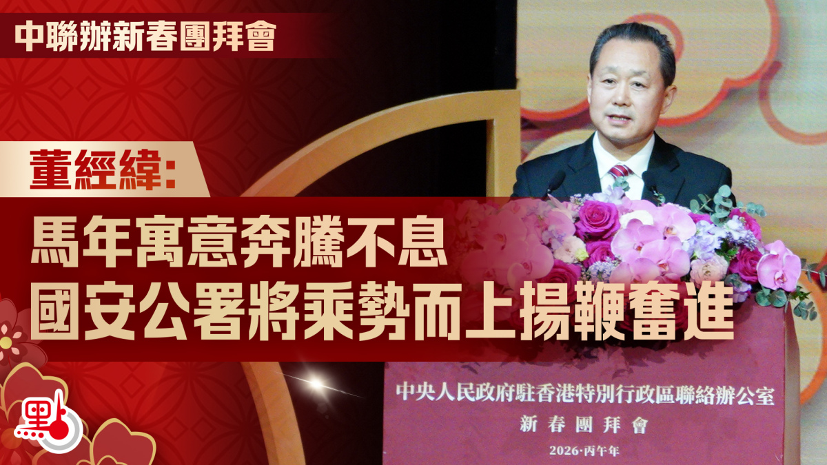 董經緯提到,2026年是國家「十五五」規劃開局之年,也是香港加快由治及興進程的關鍵一年。馬年寓意着奔騰不息、奮勇向前,駐港國家安全公署將乘勢而上、揚鞭奮進,切實發揮職能作用,堅定不移貫徹「一國兩制」方針,支持行政長官和特別行政區政府履職盡責,支持香港更好融入和服務國家發展大局,保持長期繁榮穩定。