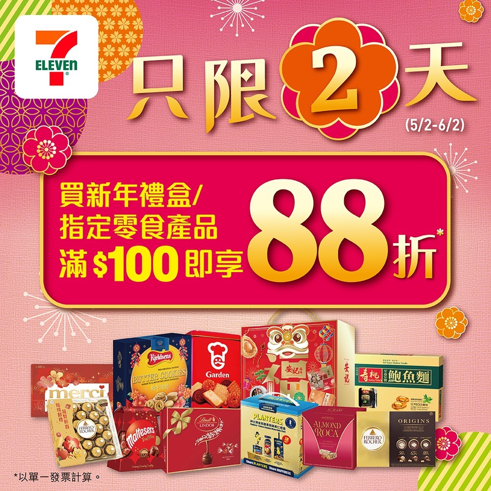 【點新聞報道】7-11新年禮盒/指定零食88折優惠登場,只限2天,是時候入定年貨啦。由即日起至2月6日到7仔買新年禮盒/指定零食產品滿$100,即享有88折優惠。