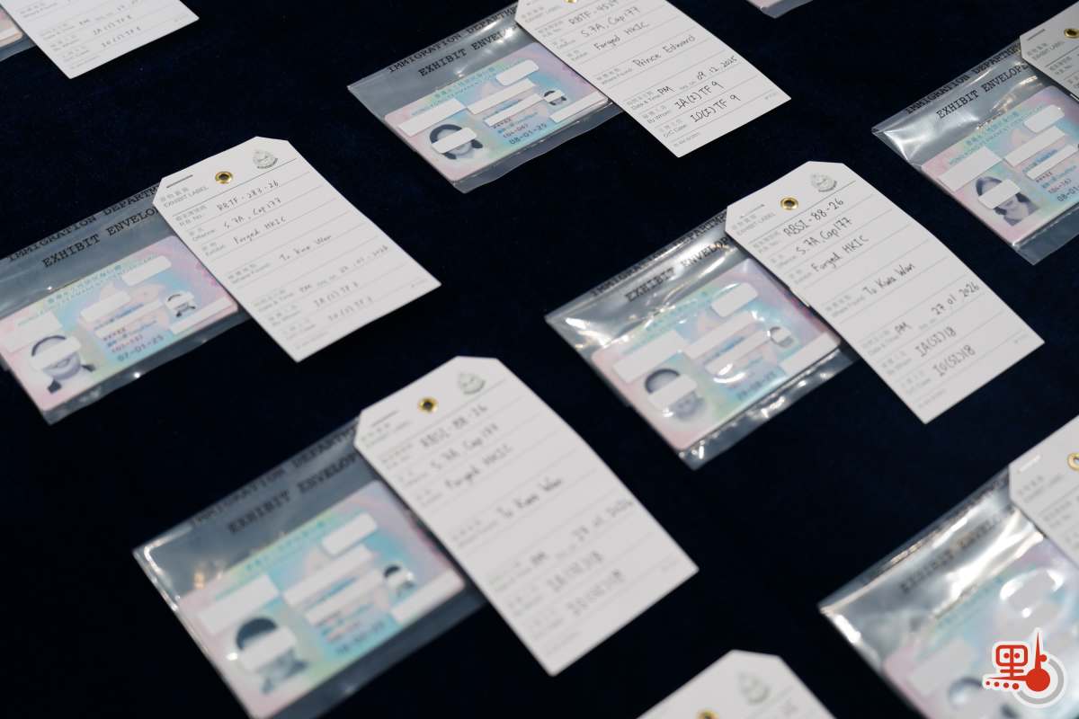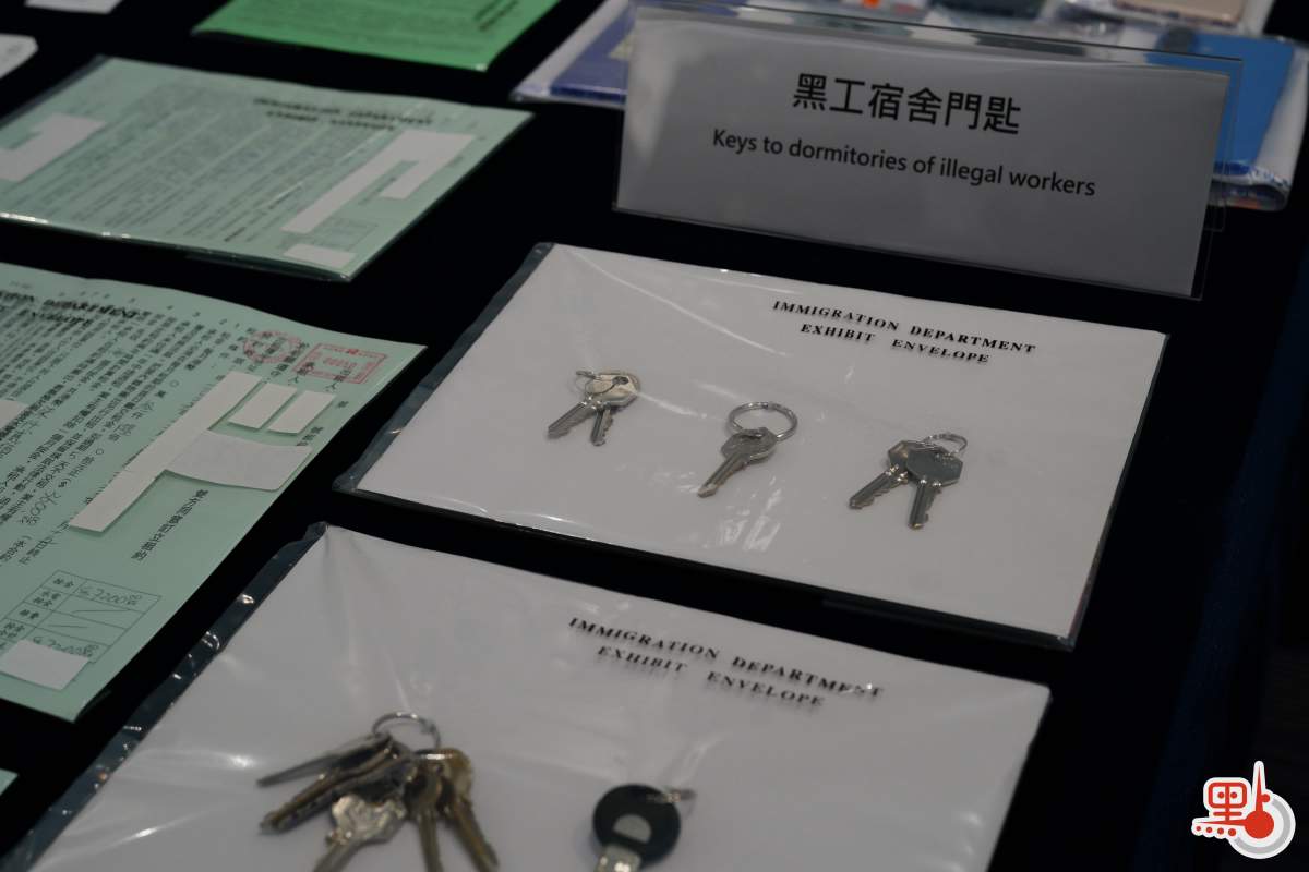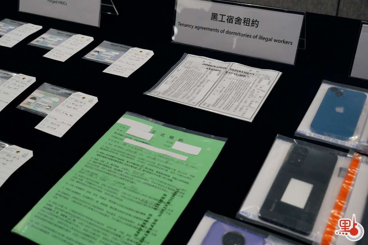 去年11月,粵港執法機關經情報互換及分析,入境處調查人員成功鎖定一批懷疑在港非法工作的人士。他們的流動性高,常往返內地及香港,大大增加了調查的難度。調查人員對他們的活動軌跡進行了深入分析,成功在短時間內鎖定多個懷疑黑工宿舍及工作地點。黑工宿舍門外裝有閉路電視,相信是為了用來防範執法人員的巡查。行動中,執法人員在其中一個由集團主腦操控的黑工宿舍內,搜出超過20張偽造香港身份證。這些偽造證件被藏在一些相當隱蔽的地方,如夾在書本內或藏在奶粉罐內。