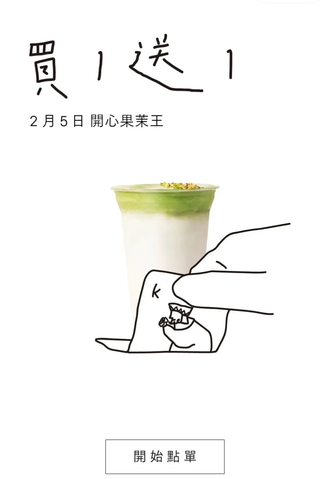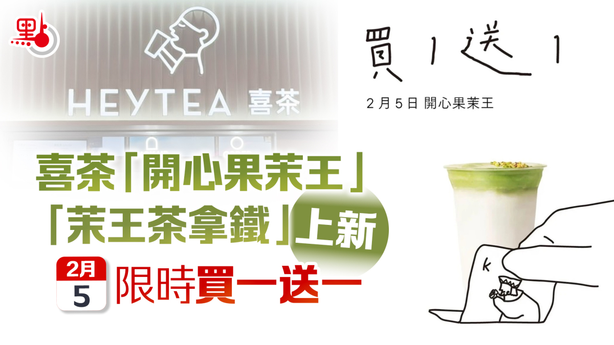 2月5日當天於heytea App/小程序/門店pos機下單購買「開心果茉王」和「茉王茶拿鐵」,活動期間享買一送一優惠(限自取),每單限贈一杯,每個賬號活動期間限享一次優惠,不與其他優惠券同享,付費加料不包含於優惠內。