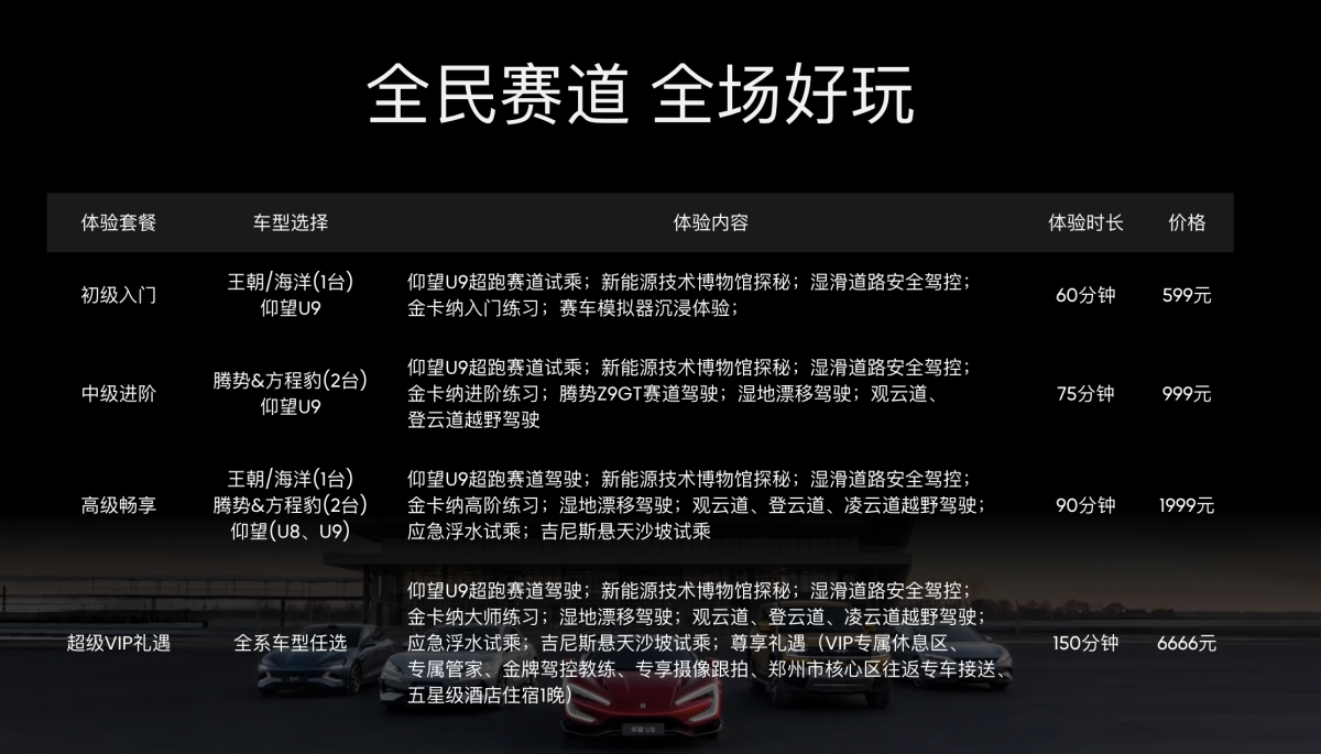 在賽道試駕方面,場內建有1758米賽道,設計包含4個左彎、5個右彎及550米直道,參與者可駕駛仰望U9感受超跑級性能,體驗從起步加速到高速過彎的完整賽道樂趣。