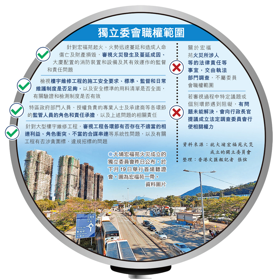 香港特區政府就大埔宏福苑火災成立的獨立委員會昨日上午舉行指示會議,就委員會日後進行聽證會時的安排給予指示,包括確定有意出席日後聽證會的人士、機構或其法律代表等,並公布將於下月19日舉行首場聽證會。委員會首席代表大律師杜淦堃會上透露,根據目前接收的資料等綜合分析,已掌握到火災成因等方面的關鍵證據,顯示存在一系列的結構性問題,是不能接受和不能忽視,需要在聽證會向公眾披露並解釋。委員會主席陸啟康強調,委員會核心調查方向主要分為兩大方面,首先是宏福苑火災成因、蔓延及造成傷亡的相關問題,其次是大型樓宇維修工程各環節是否存在涉貪及圍標等問題,並圍繞這兩大方向檢視現行相關法律的規管以及懲罰是否足夠,提出相應建議。