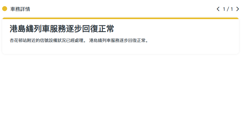 今早9時28分,港鐵表示,杏花邨站附近的信號設備狀況已經處理,港島綫列車服務已逐步恢復正常。