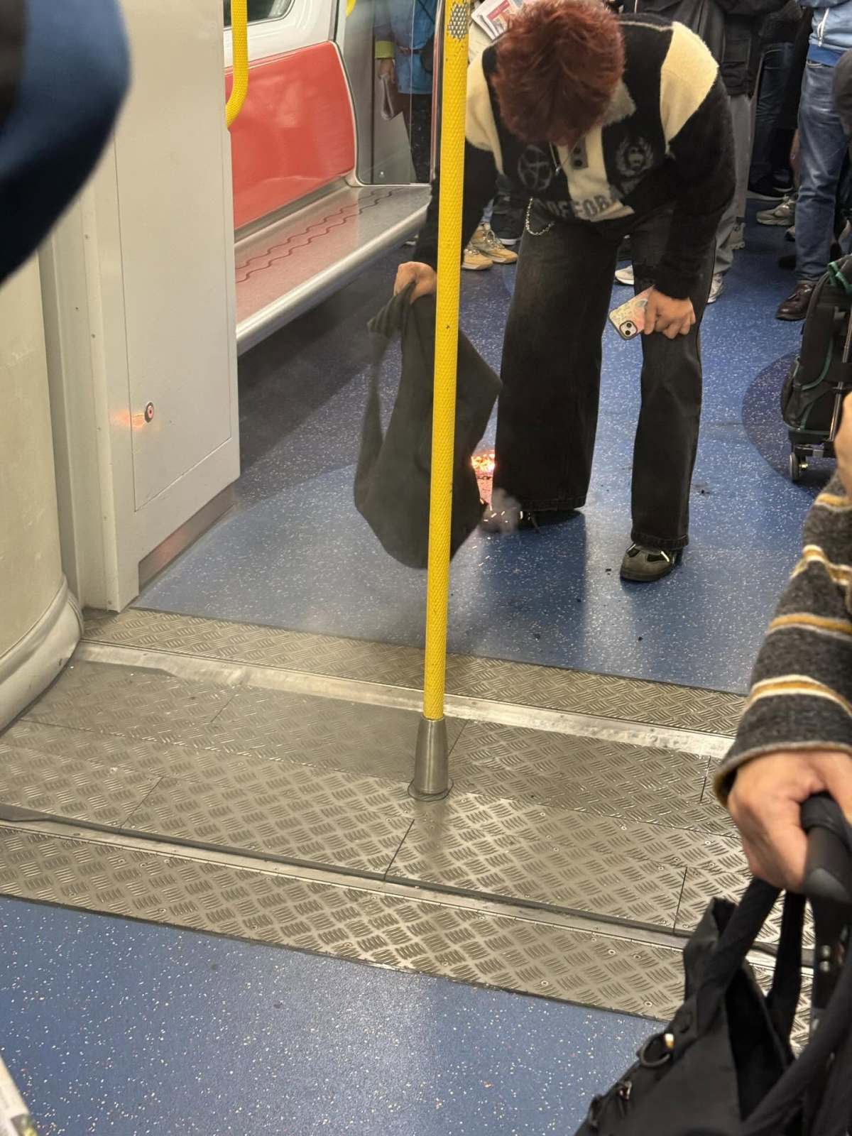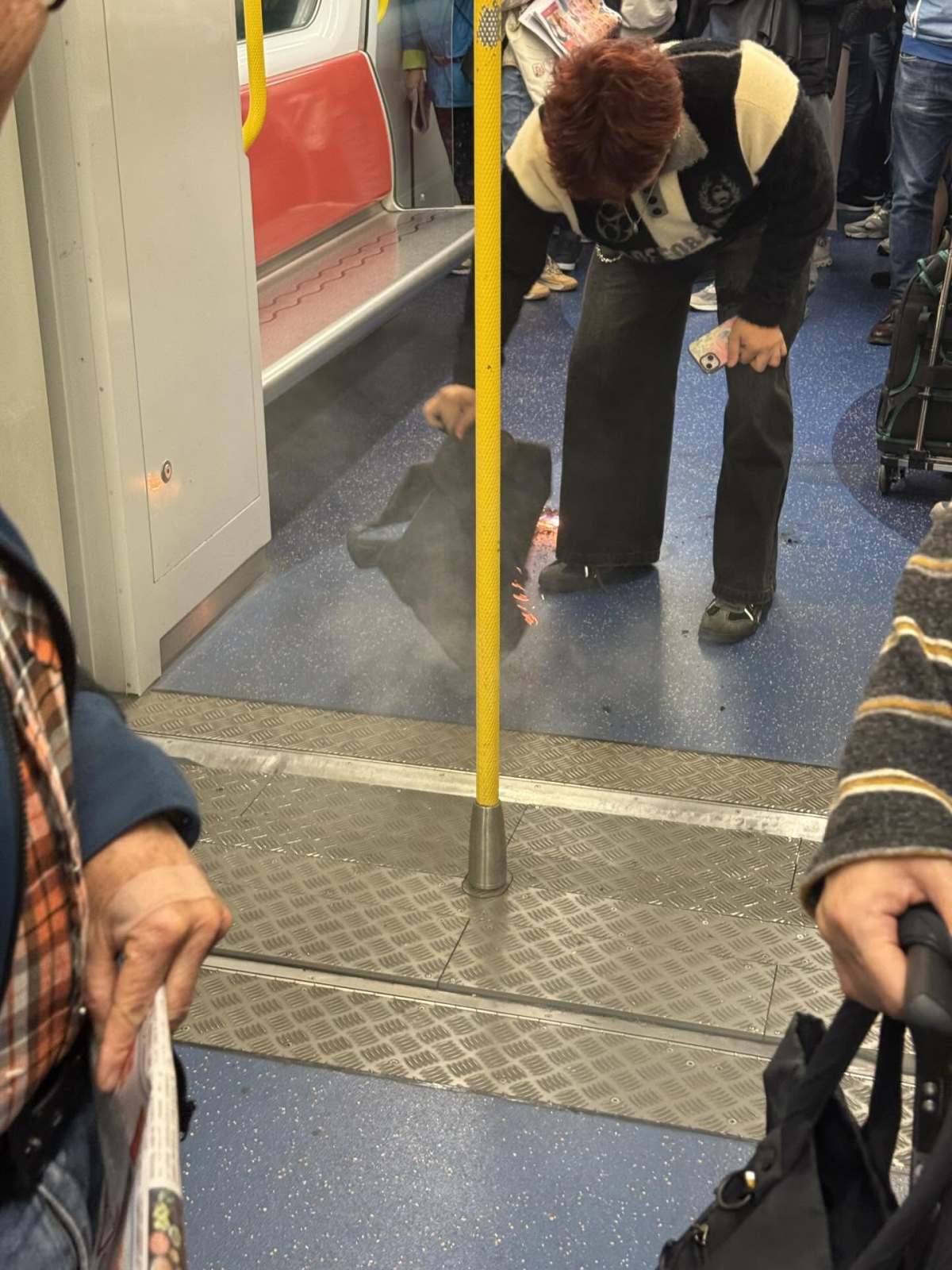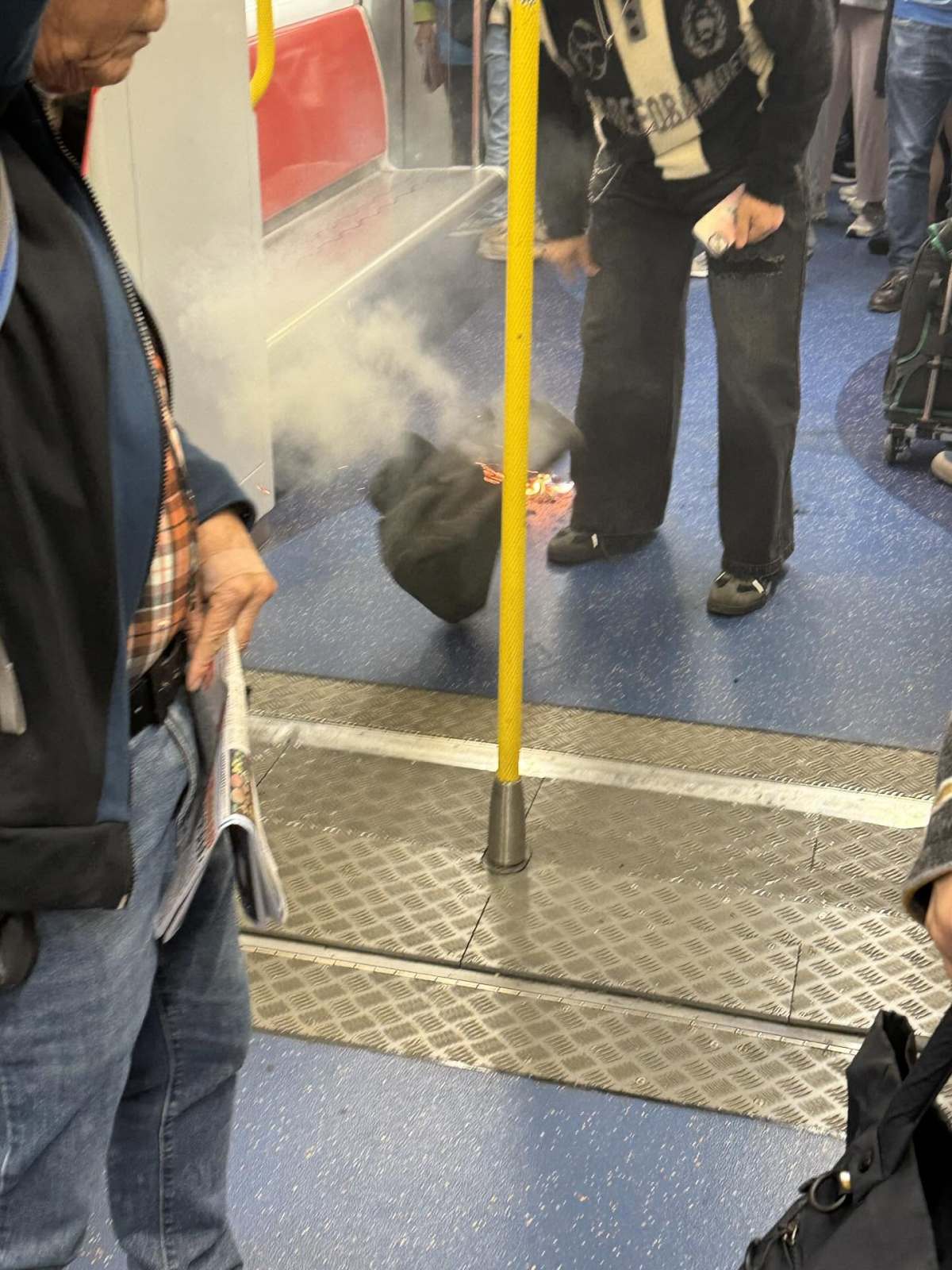 網上影片可見,一個黑色手挽袋冒出大量濃煙,袋中火光熊熊,有乘客用滅火筒滅火。有網民憶述,當時列車從錦上路站開往荃灣西站時,有人突然尖叫,詎料「見到白煙極速升起,啲煙都幾濃」,並指「有幾秒係唞唔到氣嘅感覺,差啲以為自己下一秒會black out」,有乘客用滅火筒滅火並聯絡車長。