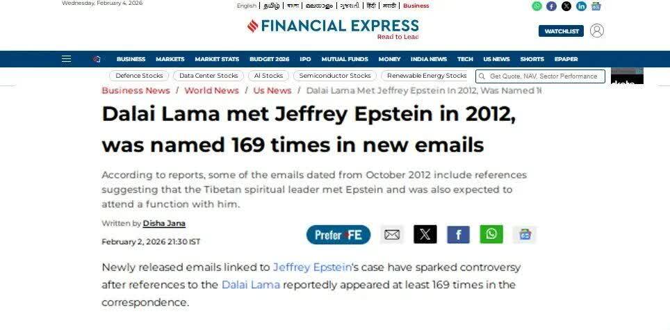 2月2日,印度《金融快報》報道稱,達賴喇嘛曾於2012年與傑弗里·愛潑斯坦會面,在美國司法部新公布的愛潑斯坦電子郵件中,達賴的名字被提及169次。