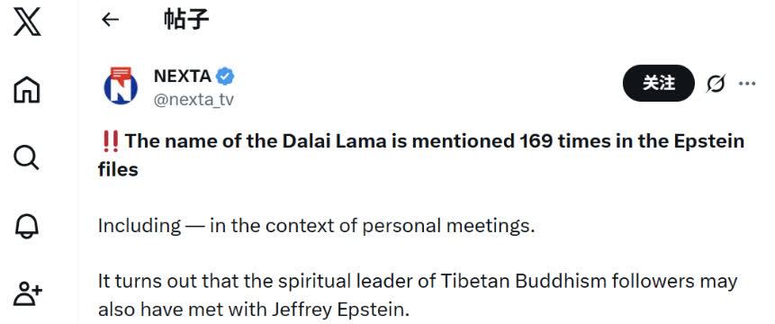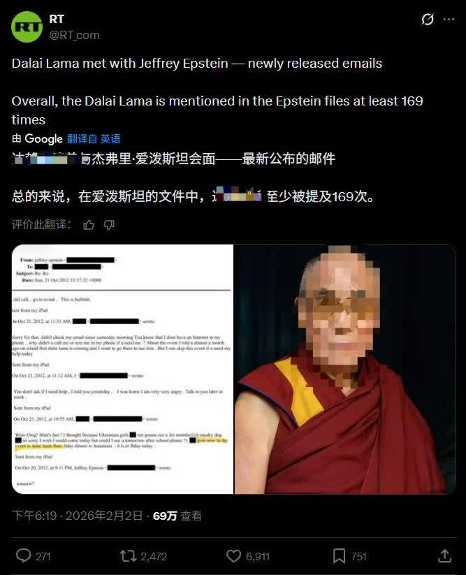 同日,「今日俄羅斯」(RT)在X上發帖稱,在最新公布的郵件中,達賴與傑弗里·愛潑斯坦會面的相關內容被曝光。總的來說,在愛潑斯坦的文件中,達賴至少被提及169次。