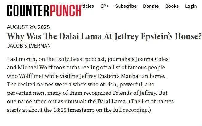 另據美媒報道,早在去年8月29日,美國「反擊」網站(COUNTERPUNCH)就發布了題為《達賴喇嘛為何會出現在傑弗里·愛潑斯坦的家中?》文章,並提到「上個月,一位名叫邁克爾·沃爾夫的記者在《每日野獸》播客中講述了在愛潑斯坦位於曼哈頓的聯排別墅舉行的聚會上,見到了達賴。」當他被問及達賴為何會出現在那裏時,沃爾夫表示,達賴出現的原因很可能與經濟利益有關。文章還提到2009年達賴出席過邪教組織NXIVM的活動並發表演講,以此獲得了100萬美元的報酬。
