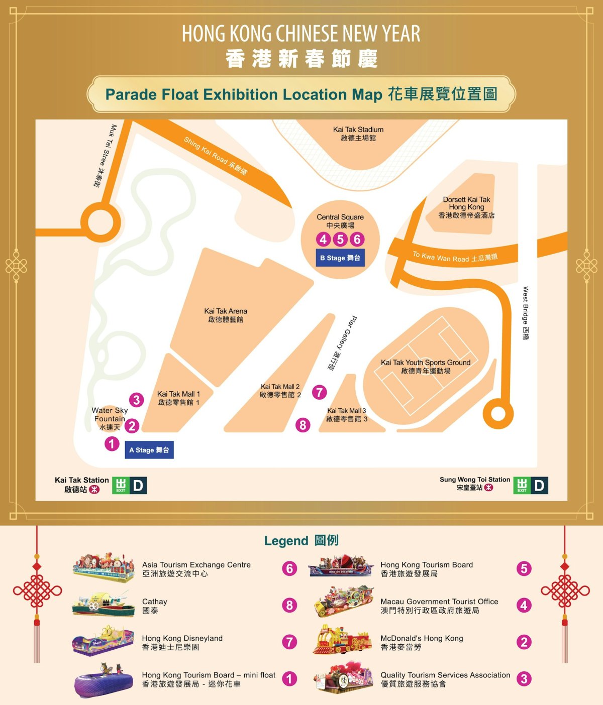 由年初二(2月18日)起,花車與表演團隊將於全城多區展出與演出。其中八輛花車會首度於啟德體育園展出,年初二及年初三(2月18日及19日)更有多支參與匯演的內地及國際表演隊伍即場獻技。