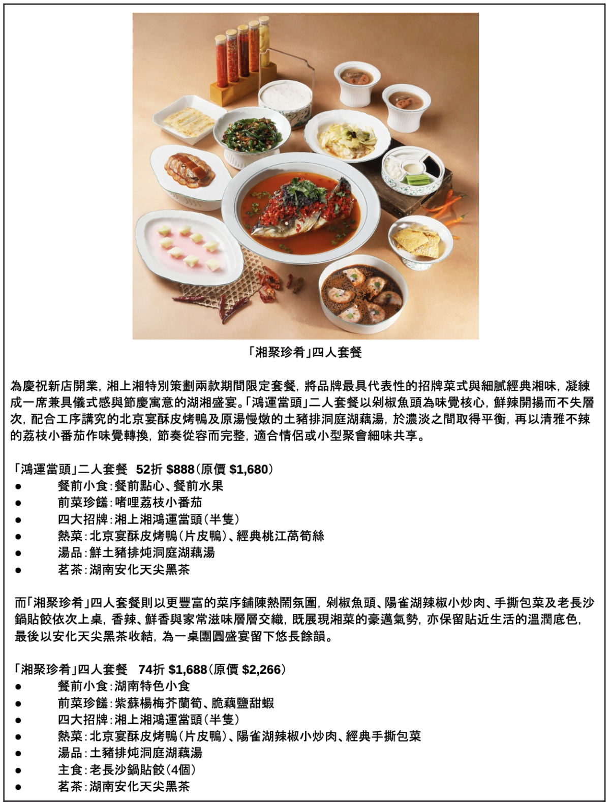 迎接新春佳節,「湘上湘」推出多款節慶套餐及宴席,由涼菜、熱菜、主食、甜品到茗茶一應俱全,菜式數量由13道至23道不等,既保留傳統新年的儀式感,亦兼顧現代聚餐的節奏與層次。其中最特別的是香港限定「鴻運當頭」二人套餐及「湘聚珍餚」四人餐,從剁椒魚頭、樟樹港辣椒系列,到湯品與手工菜式,結合招牌菜與經典湘味,為新的一年,獻上最真摯的團圓、興旺與好運祝福!