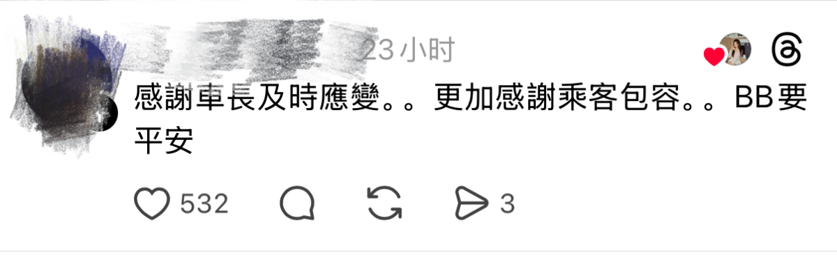 發文者於帖文中表達對嬰兒的關切,寫道「希望BB冇事」,並讚揚司機有愛心,同時亦獲不少網民附議。事件引起網上熱議,許多網民對車長應變表示讚賞,認為「高速公路要搵架白車比你真係唔易,司機堅抽」,同時肯定車上乘客的包容,指「乘客都好好」、「乘客有愛,無嘈無鬧」,共同促成這次救援。另有網民建議向城巴公司表揚司機,獲發文者回覆「已回饋」。