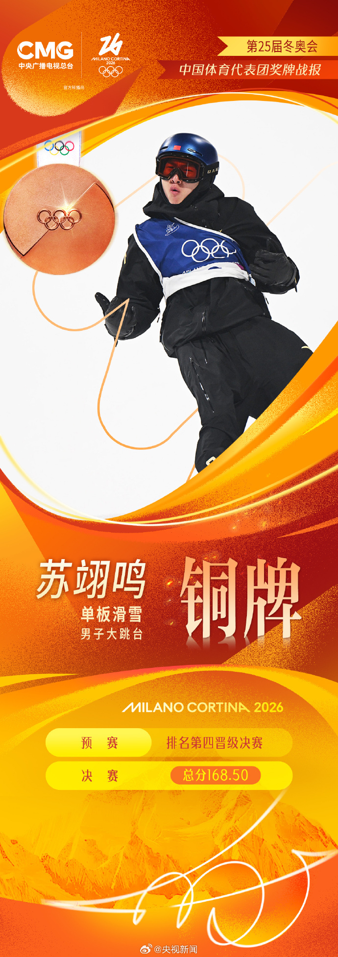 【點新聞報道】據央視體育報道,北京時間2月8日,在米蘭-科爾蒂納冬奧會單板滑雪男子大跳台決賽中,中國選手蘇翊鳴獲得銅牌,這是中國體育代表團在本屆冬奧會獲得的首枚獎牌。