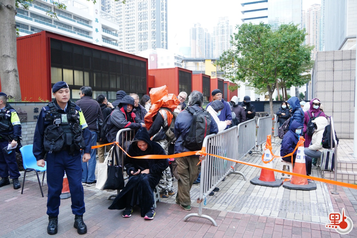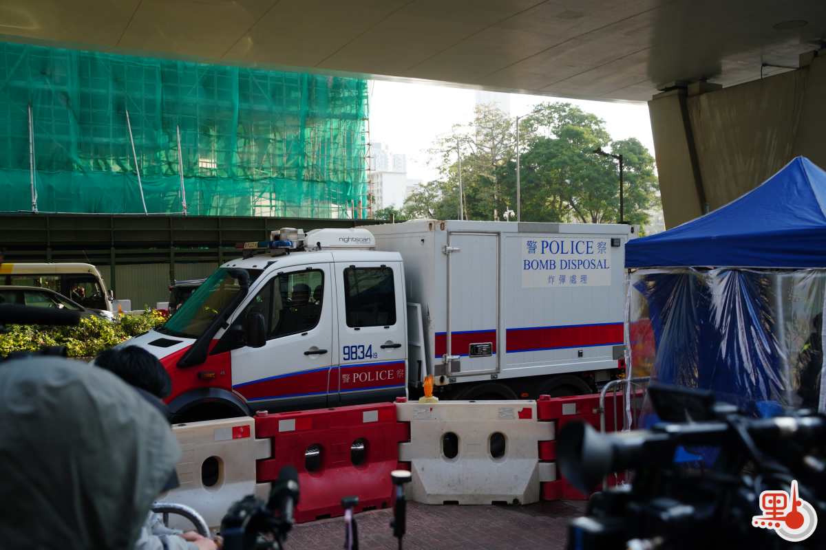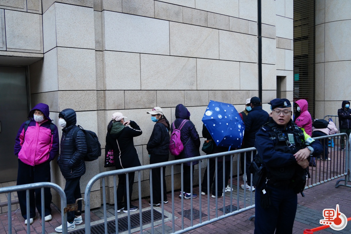點新聞記者今早在西九龍法院外見到,早上8時,有約百名市民有序排隊輪候旁聽籌,記者區站滿逾百名中外記者,附近有數十名警員維持秩序,法院大樓周邊設有鐵馬圍起輪候區,附近有炸彈處理車等警車戒備。
