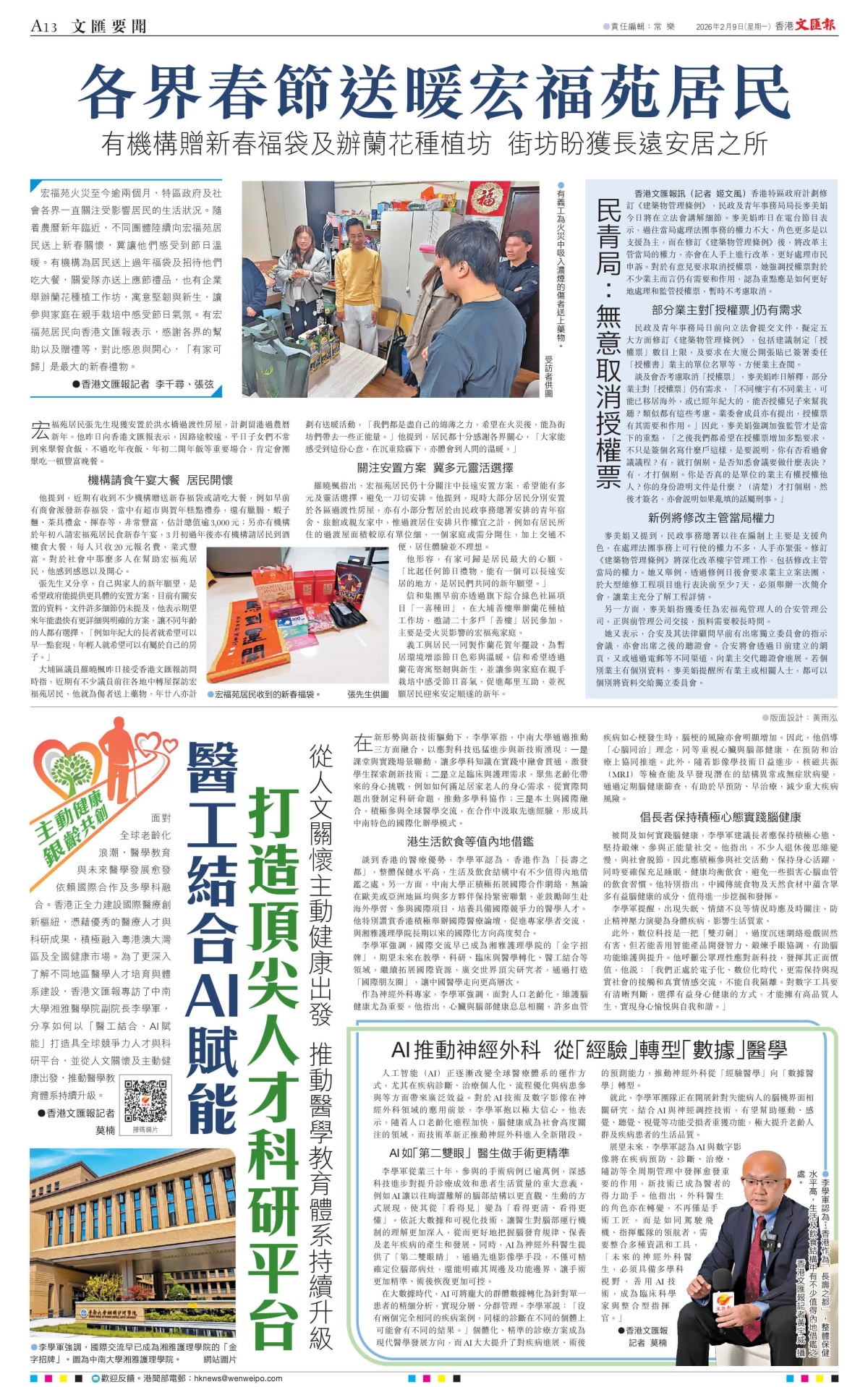 (香港文匯報記者 李千尋、張弦)宏福苑火災至今逾兩個月,特區政府及社會各界一直關注受影響居民的生活狀況。隨着農曆新年臨近,不同團體陸續向宏福苑居民送上新春關懷,冀讓他們感受到節日溫暖。有機構為居民送上過年福袋及招待他們吃大餐,關愛隊亦送上應節禮品,也有企業舉辦蘭花種植工作坊,寓意堅韌與新生,讓參與家庭在親手栽培中感受節日氣氛。有宏福苑居民向香港文匯報表示,感謝各界的幫助以及贈禮等,對此感恩與開心,「有家可歸」是最大的新春禮物。