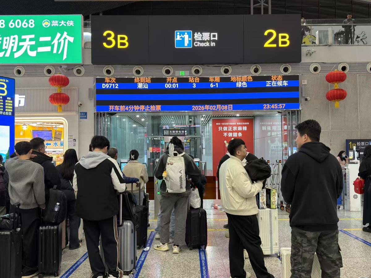 深圳火車站表示,計劃持續加大熱門方向運力投放,節前深圳鐵路預計累計開行夜間高鐵594列,其中,2月9至10日、12至15日0點至6點,深圳北站日均加開往返成都、南昌、長沙、武漢、湛江、潮汕等方向的夜間高鐵78列,福田站日均加開往返桂林、婁底、長沙、懷化等方向高鐵9列。2月9至10日、12至16日0點至6點,深圳站日均加開往返湛江、汕頭、南昌、梅州等方向的夜間高鐵10列,通過加開夜間高鐵,全力保障旅客返鄉過節需求。
