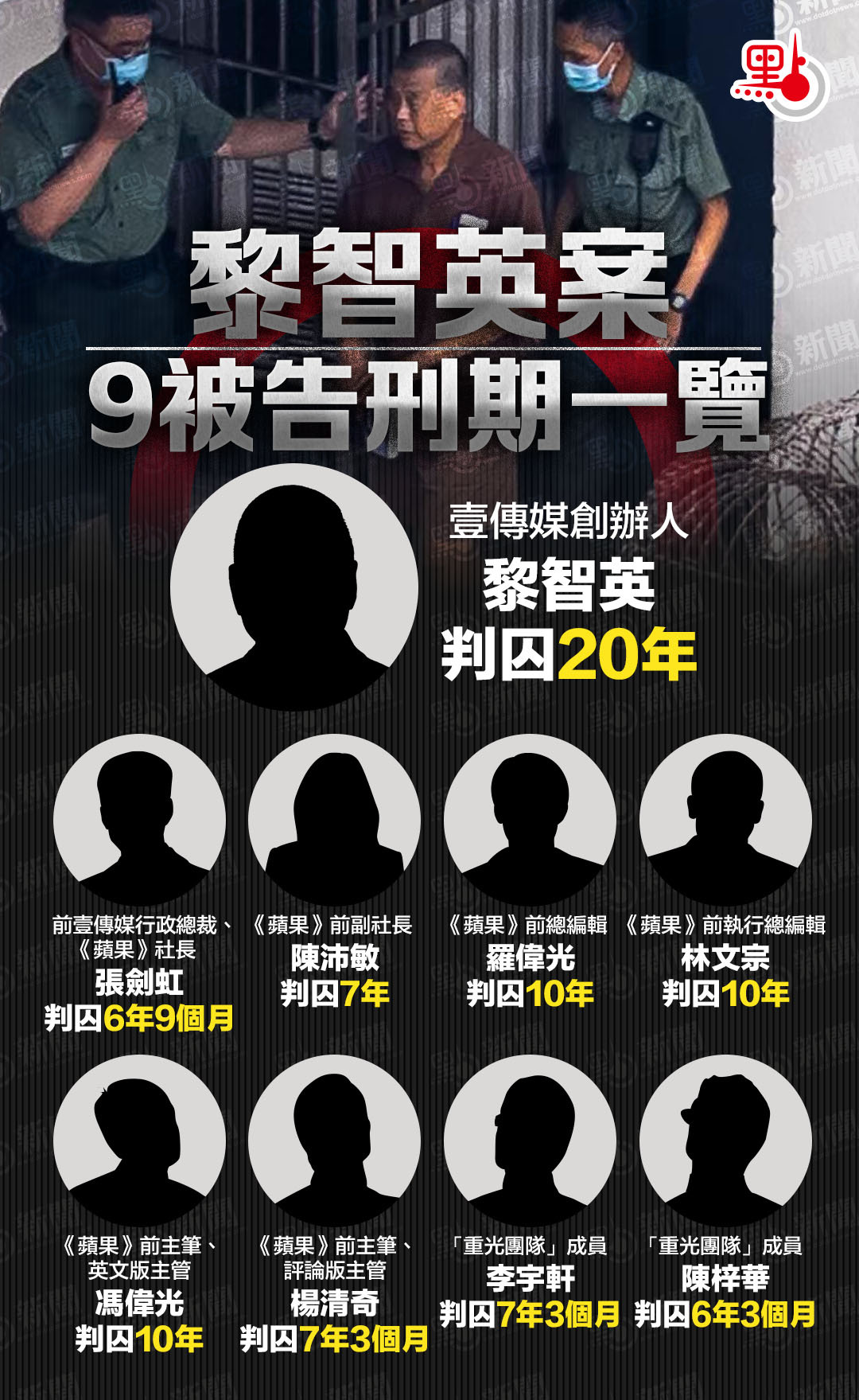 黎智英被判20年監禁,其中18年分期執行