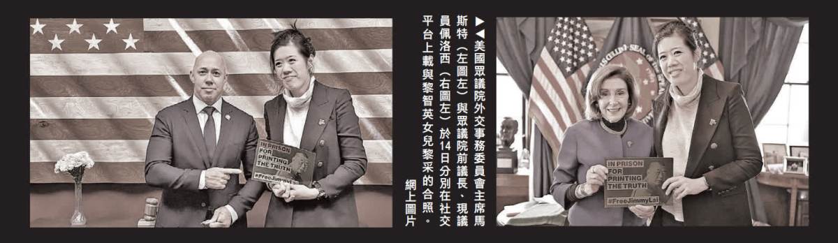 審結的黎智英案在等待判刑期間,他的女兒黎采屢屢接受外國傳媒訪問,惡意抹黑香港特區政府和懲教署,而美方竟公然叫囂要求釋放黎智英。日前,黎采獲美國眾議院外交事務委員會主席馬斯特(Brian Mast)及美國眾議院前議長佩洛西(Nancy Pelosi)接見,馬斯特和佩洛西均在自己的社交平台發布見面時的合照,並表達對黎智英的支持。