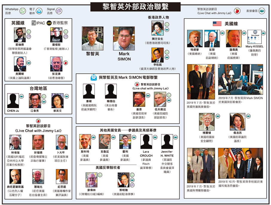 黎智英原定2020年7月訪美,承認曾要求「制裁」中央政府與香港特區政府官員。黎智英於香港國安法實施後仍在《華爾街日報》發表文章,以及接受《紐約時報》和自由亞洲電台(RFA)訪問,呼籲美國對香港實施「制裁」、撤銷香港特殊地位及實施貿易與科技禁運等。