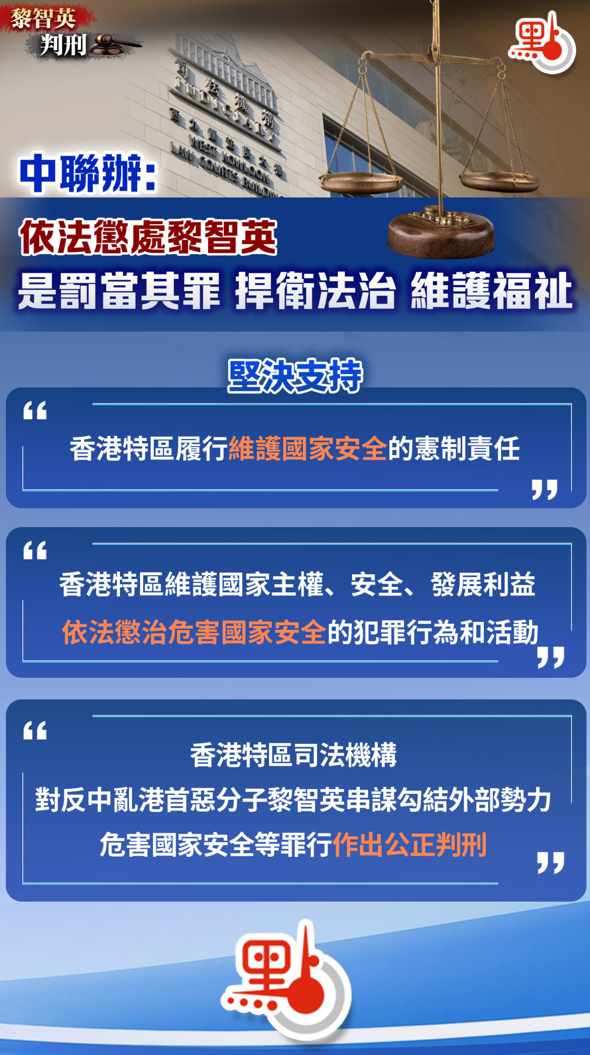 【點新聞報道】2月9日,中央人民政府駐香港特別行政區聯絡辦公室發言人發表談話,堅決支持香港特區履行維護國家安全的憲制責任,堅決支持香港特區維護國家主權、安全、發展利益,依法懲治危害國家安全的犯罪行為和活動,堅決支持香港特區司法機構對反中亂港首惡分子黎智英串謀勾結外部勢力危害國家安全等罪行作出公正判刑。
