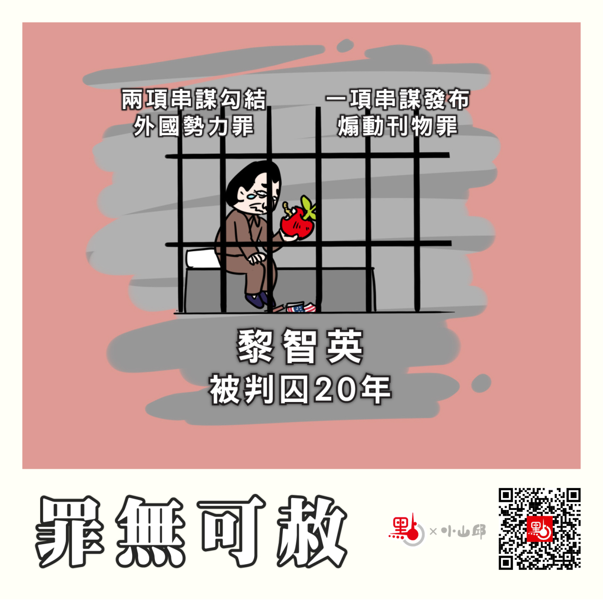 黎智英去年12月被裁定兩項「串謀勾結外國或者境外勢力罪」及一項「串謀發布煽動刊物罪」全部罪名成立,昨天被判囚20年,其中18年與欺詐案刑期分期執行;同案的《蘋果日報》三間公司亦被裁定「串謀發布煽動刊物罪」及「串謀勾結外國或者境外勢力罪」罪名成立,各被判罰款3,004,500元。