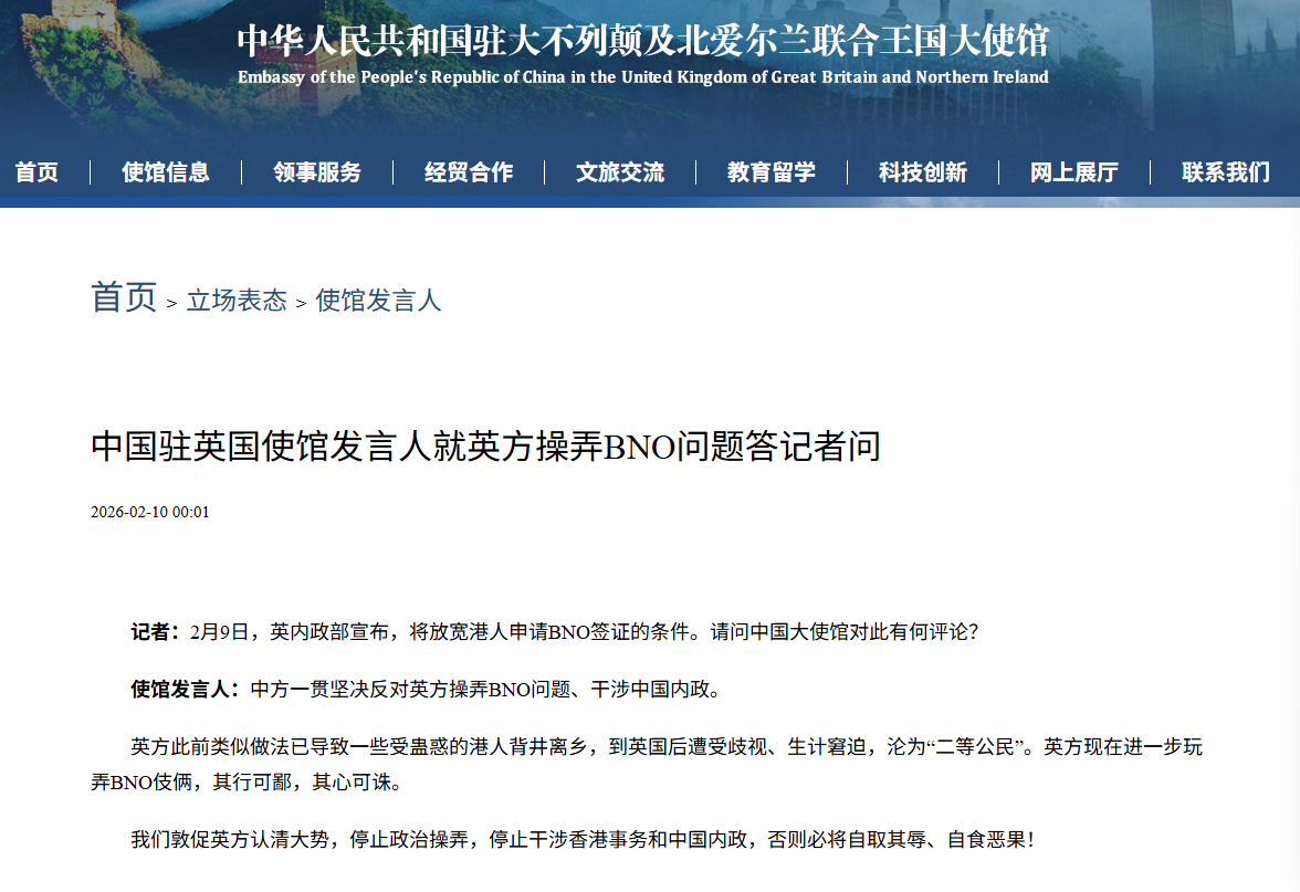 【點新聞報道】2月9日,英國內政部宣布,將放寬港人申請BNO簽證的條件。中國駐英國使館發言人對此表示,中方一貫堅決反對英方操弄BNO問題、干涉中國內政。英方此前類似做法已導致一些受蠱惑的港人背井離鄉,到英國後遭受歧視、生計窘迫,淪為「二等公民」。英方現在進一步玩弄BNO伎倆,其行可鄙,其心可誅。