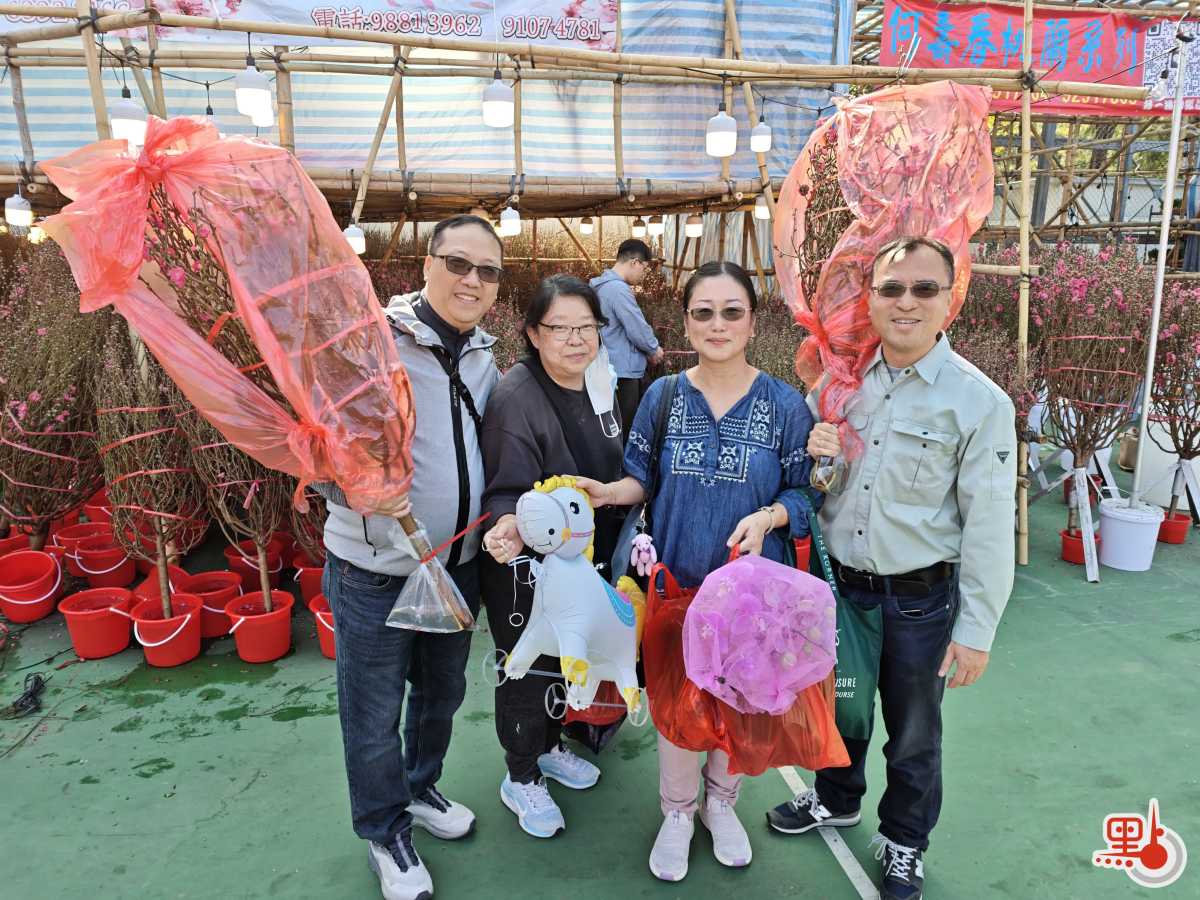 市民黎先生一行人手捧桃花、水仙及蝴蝶蘭等戰利品,今日滿載而歸。他表示,是次預算控制在一千元內,「價格合理,同往年差不多,有一百蚊三棵,好點一百蚊一棵,桃花三四百蚊都有。」新年將至,他說自己將留港過年,是次購花會「擺啲返屋企,望到開心啲,過年有氣氛」。