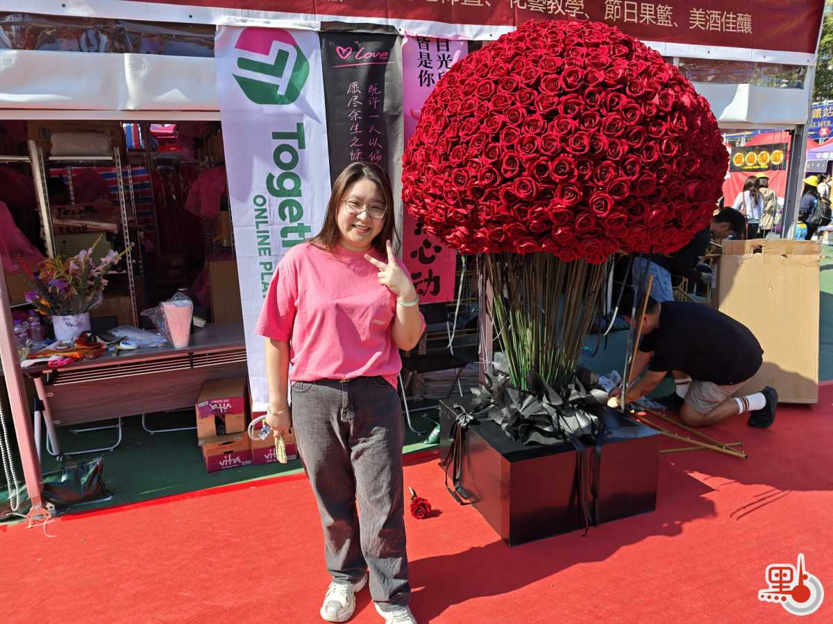 在眾多鮮花攤位中,一個以玫瑰花製作的巨型裝置格外搶眼,不少市民紛紛與其合影留念。裝置製作者、花藝師霍小姐介紹,情人節即將到來,此是她耗時近5日,選用1314枝玫瑰製作而成;此外,配合馬年新春主題,她亦使用人造絹花等組成馬樣式裝飾,「希望大家開開心心,情人終成眷屬。」