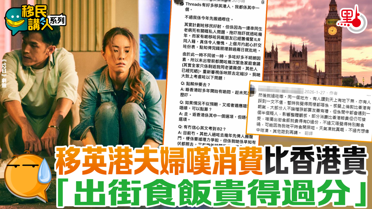 一名移英港男在社交平台threads發文,指自己與太太今年移民去英國,由於多咗好多不明朗因素,所以未出發前與太太開咗幾次緊急家庭會議,重新審視係咪照去定縮沙。他提到要考慮的問題,包括:點解仲要去?如果情況不似預期,又或者適應唔到、頂唔順,可以點算?有冇信心英文考到B2?揀邊個城市?