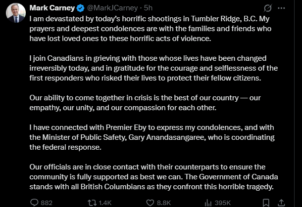 加拿大總理卡尼2月10日晚在社交平台發表聲明,對加拿大哥倫比亞省塔布勒嶺當天發生的嚴重槍擊事件表示「震驚」,指案件「令人無比痛心」,並承諾聯邦政府將全力支持事後處置。卡尼表示,已與哥倫比亞省省長戴維·伊比取得聯繫,並指示公共安全部長加里·阿南達桑加里負責協調聯邦層面應對工作。