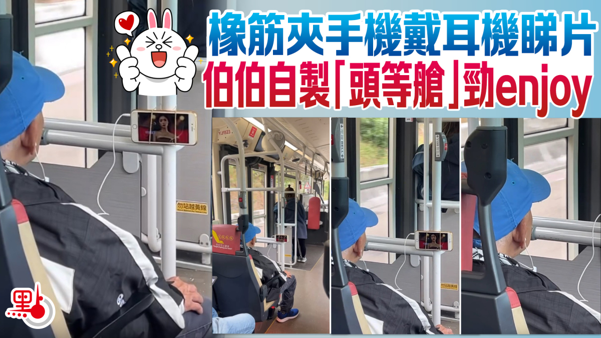該名網民在社交平台threads發布一段巴士車廂的影片,可見一名伯伯發揮生活智慧,自備橡筋將手機固定綁在扶手之上,一邊插上耳筒睇片,一邊點頭用手拍大髀打拍子,一派悠然自得。樓主發文力讚「巴士頭等有埋影視娛樂系統,戴耳機加分,睇吓哥哥打晒拍子幾enjoy」。