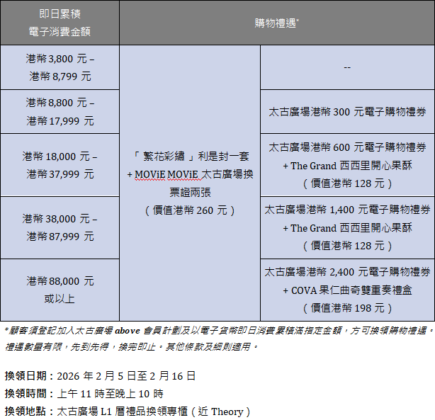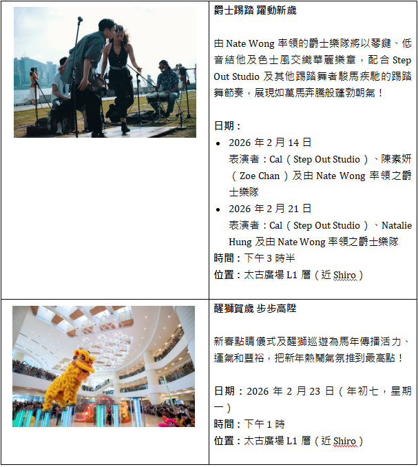 太古廣場亦精心準備連串新春活動,包括「錦繡祝願」AI揮春照相館讓您製作獨一無二的新年揮春,以及「繁花彩繡」利是封套裝與精彩購物禮遇,還有充滿活力氣息的爵士踢踏舞表演和醒獅巡遊。