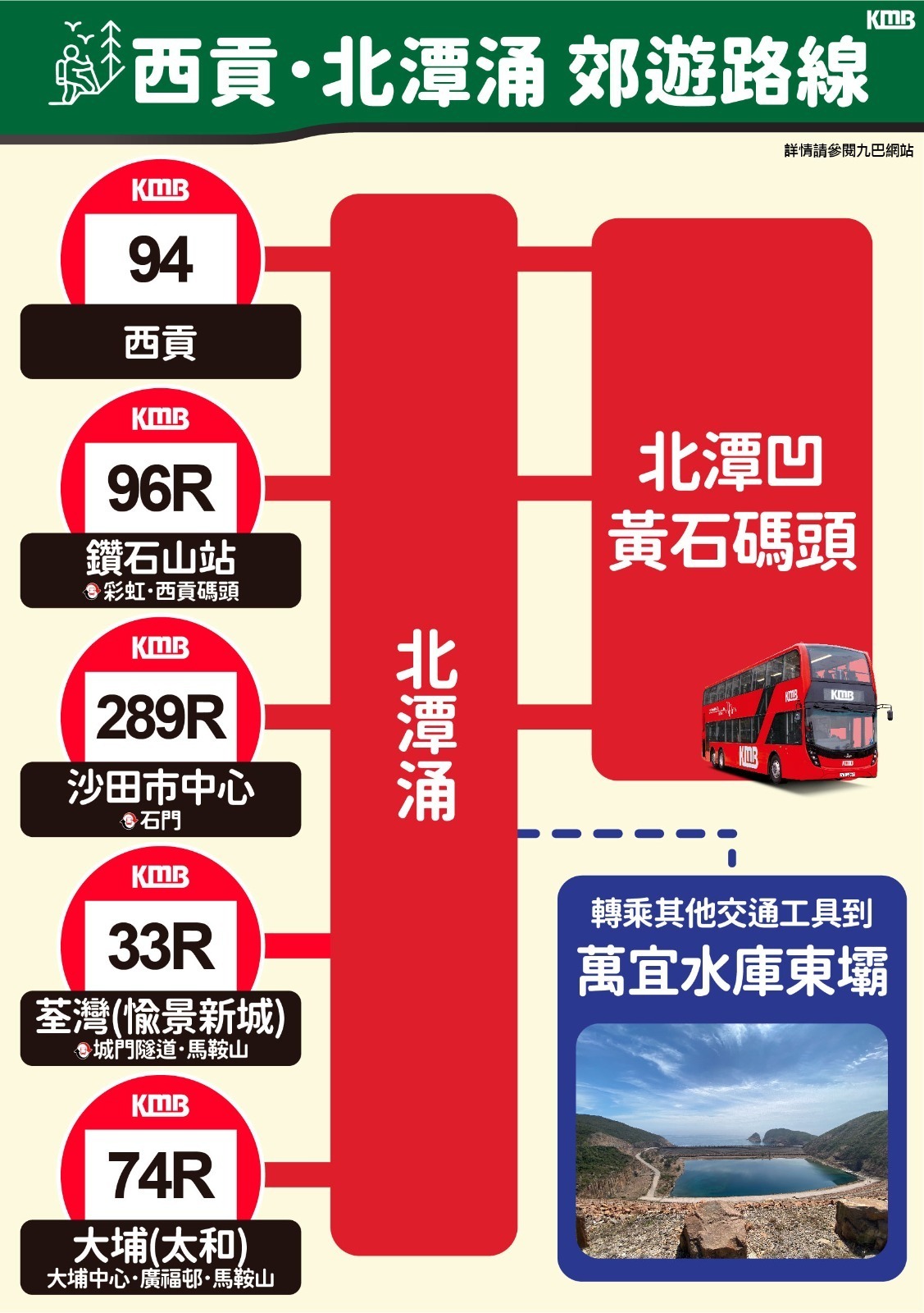 九巴亦將於2月20及23日(年初四及七)加開路線289R「沙田市中心⇋黃石碼頭」服務,內地旅客乘搭過境鐵路到沙田站後,便可於鄰近的沙田市中心巴士總站乘坐路線289R直達北潭涌及黃石碼頭;從新界西及九龍西出發的乘客,亦可在沙田市中心或石門轉車站–濱景花園轉乘路線289R。