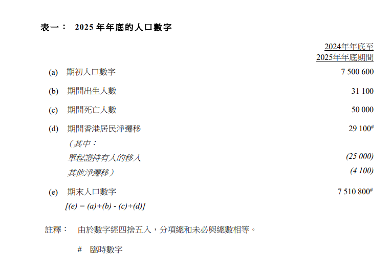 2024年年底至2025年年底期間錄得29100名香港居民淨移入(即移入多於移出)。在同期內,人口錄得18900人的自然減少(即死亡多於出生),出生人數為31100人,死亡人數為50000人。