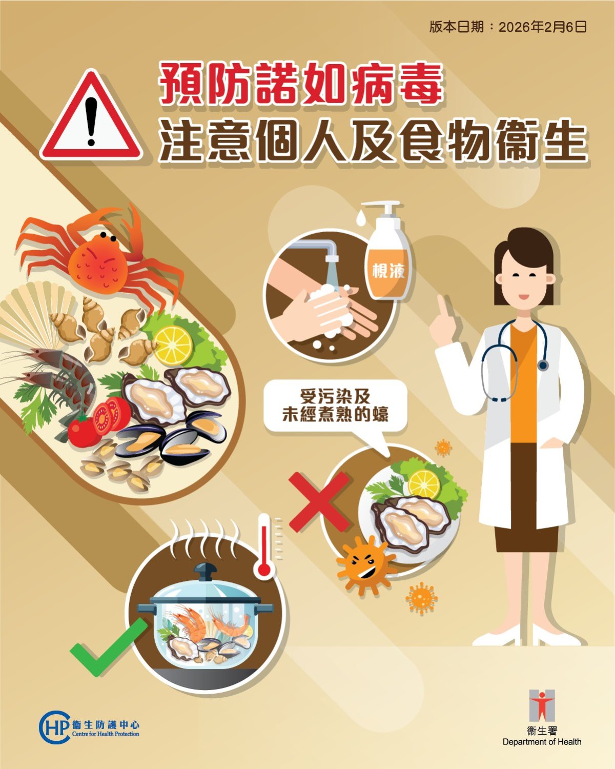 袁國勇也明確表示「食蠔喺安全㗎,但唔係生食」,又自曝「咩嘢唔煲過我都唔食」,指並非要停止進口生蠔,而是要在進食前將生蠔徹底煮熟,並做好廚房交叉感染控制。至於坊間認為洗手梘液可殺死諾如病毒,袁國勇就否認這一說法,指梘液只能在沖洗時協助沖走病毒,並不能真正「殺死佢」。