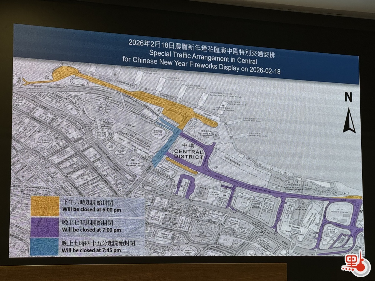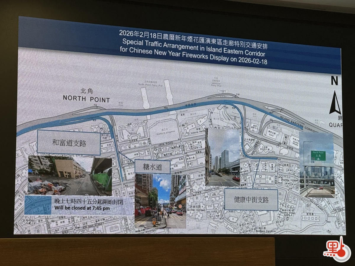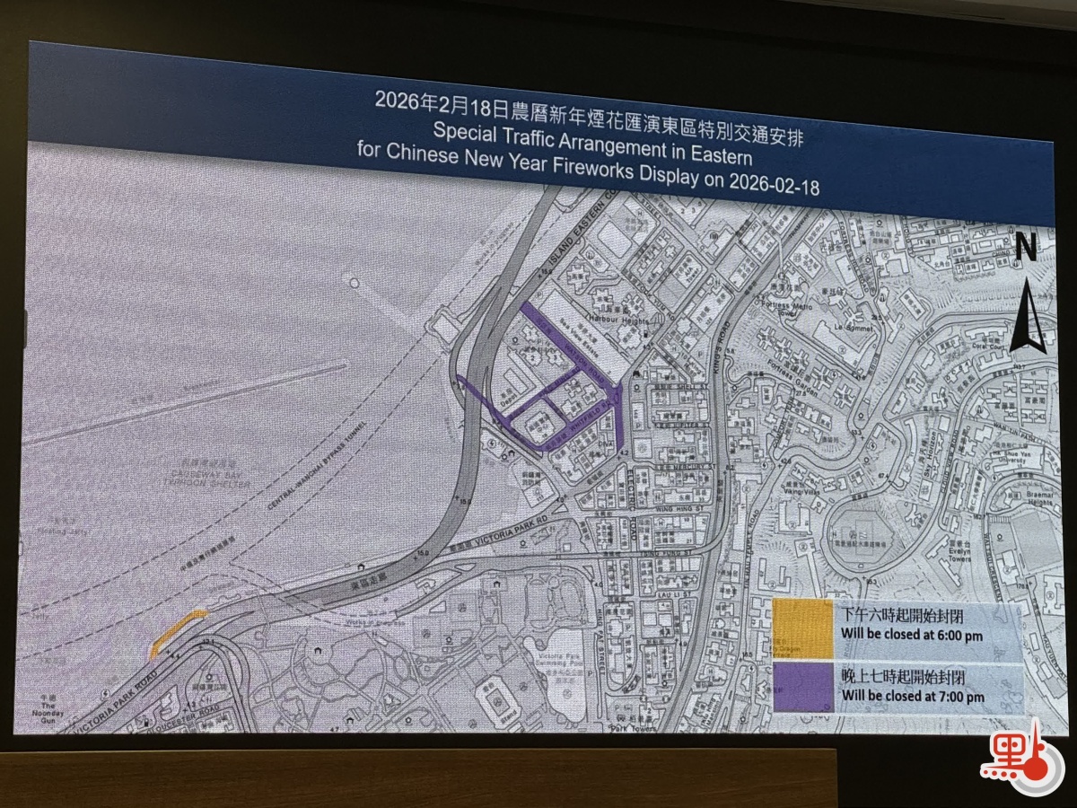 農曆新年煙花匯演將於年初二晚上8時在維港舉行,港島中區、灣仔及東區將由當天下午約6時起分階段實施封路措施及相應的改道安排。另外,介乎民康街與維園道之間的一段東區走廊(西行)會由晚上7時45分起臨時封閉,禁止車輛(專營巴士除外)駛入,直至道路重開。