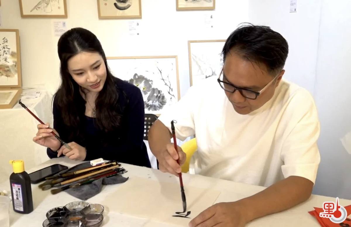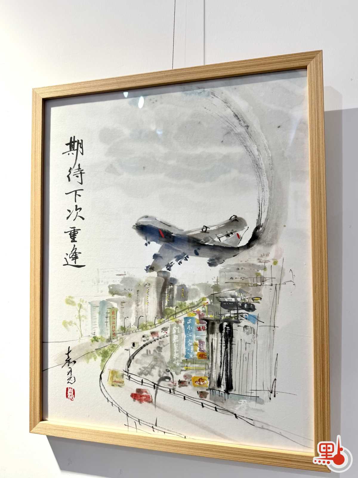 展覽中特別展出一幅三代人共同創作的作品,關嘉亮與父母、哥哥和女兒共同用水墨呈現飛機、大廈、花枝等圖案,配以關乎「離別」和「生根」含義的文字,表達全家人團聚的喜悅,以及在生活中笑着面對聚散的珍貴情感。水墨「一次落筆、無法悔改」的特性,恰似移民潮中無數家庭「愛在離別時」的瞬間,這些經歷讓關嘉亮感慨,「要學會珍惜每一個稍縱即逝的瞬間。」