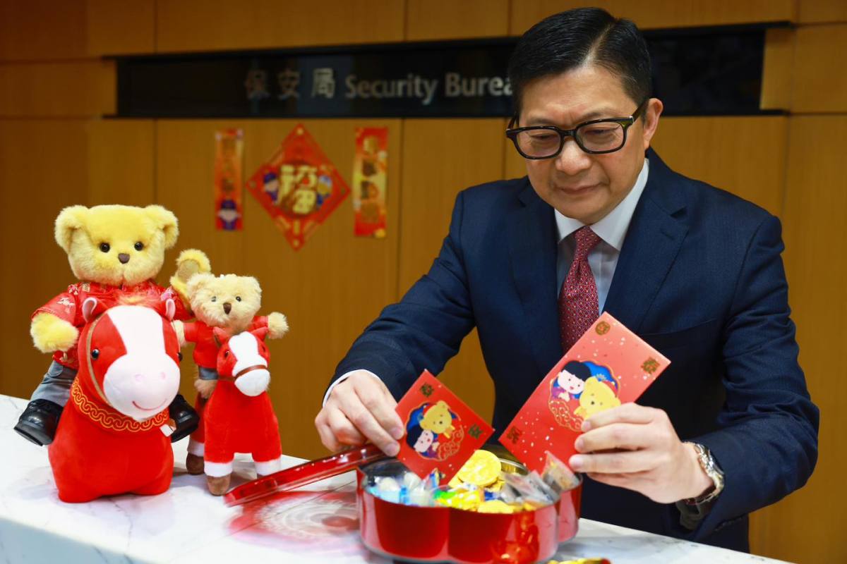 【點新聞報道】農曆新年即將到來,保安局辦公室已洋溢濃厚節日氣氛。保安局局長鄧炳強今日(12日)在社交平台分享,指不經不覺下星期就是農曆新年,他路過保安局接待處時見到同事忙着影相,原來今年除了擺攢盒,還有策馬奔騰的保安大小熊,立即成為辦公室打卡點,更說要為同事的創意點讚。