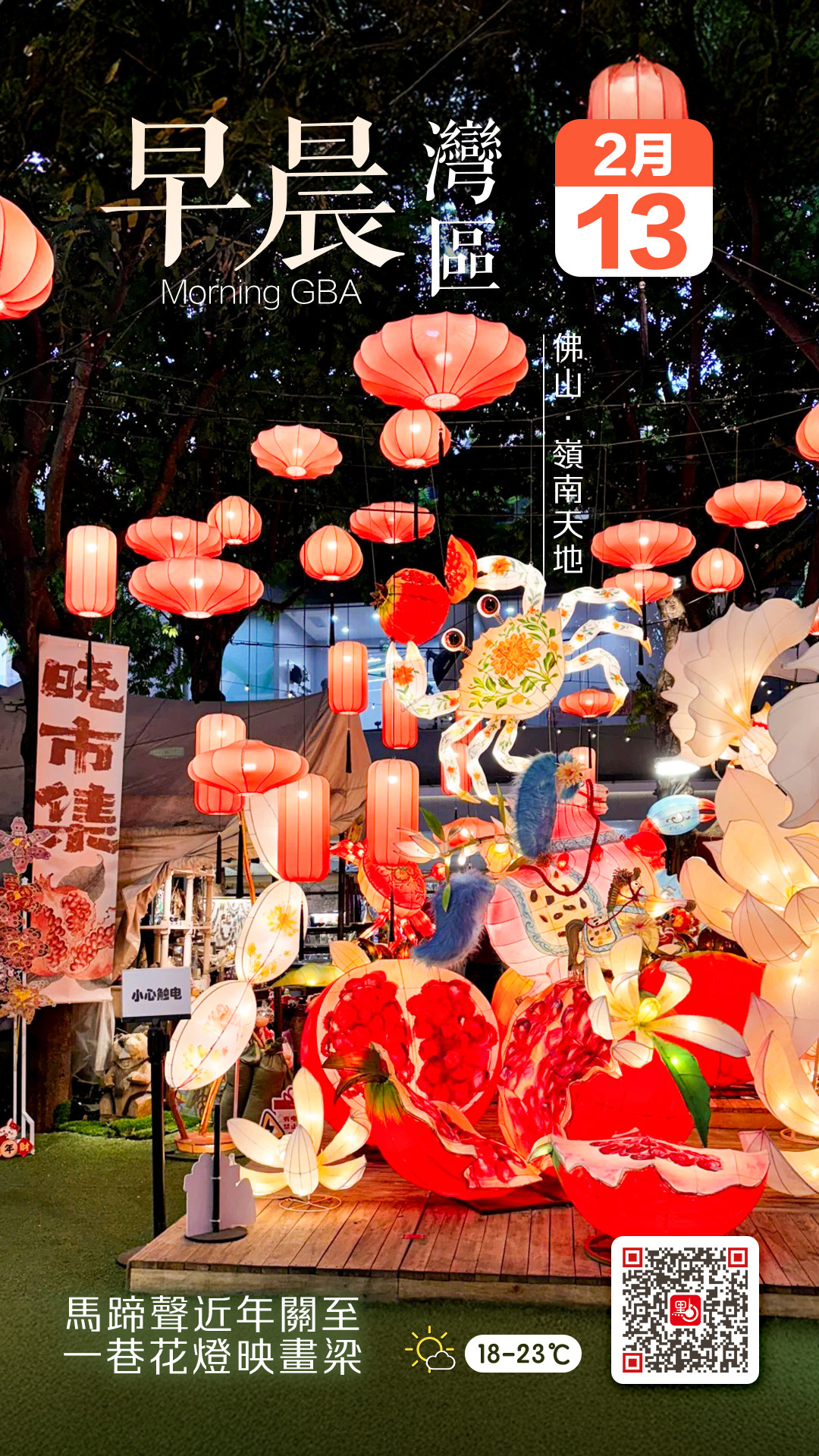 蟹形花燈攀上青磚牆,金鱗鯉魚穿行燈影之間,荷花輕曳,大石榴花燈懸於半空——中式元素鋪陳出豐饒吉慶的新春氛圍。晨光與暮色之間,光影流轉,最是出片。