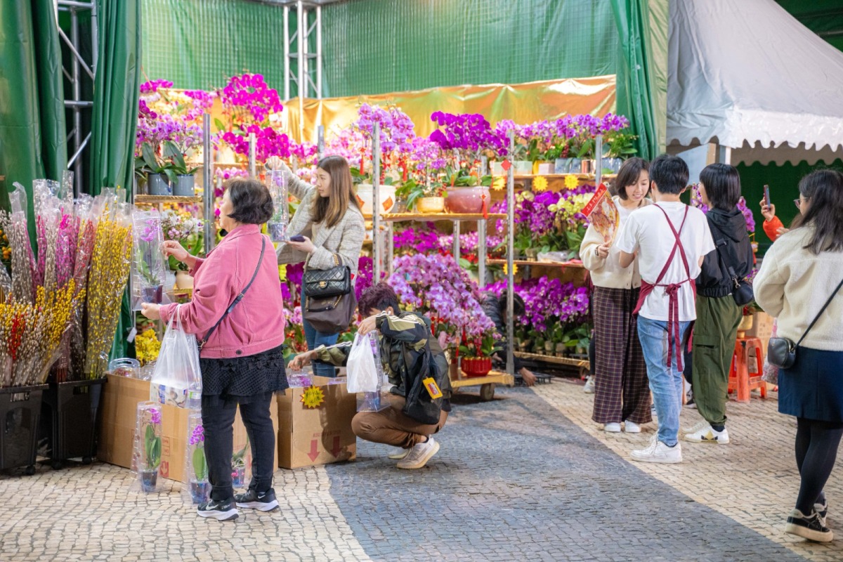 年前花市是澳門年度盛事,議事亭前地等地設攤販售年花及年宵用品,珠海灣仔花農亦參與其中。除夕夜花市人潮如織,市政機構舉辦迎春晚會,增添熱鬧氣氛。除夕團年飯後,媽閣廟、觀音堂等古廟香火鼎盛,信眾通宵參神祈福。澳門特設「燃放炮竹特區」,吸引眾多香港遊客專程前來燃放炮竹賀歲。