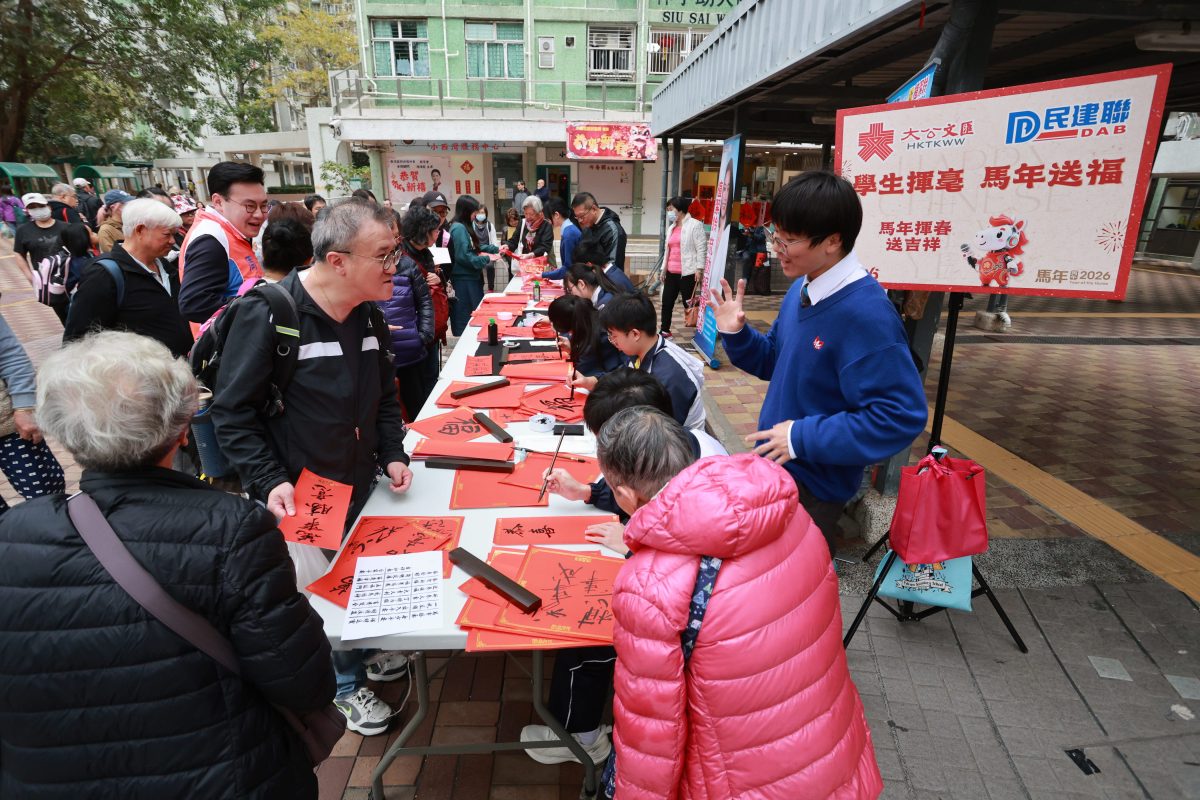 新春將至,年味漸濃。香港大公文匯傳媒集團與民建聯再度合辦「學生進社區寫揮春」活動,昨日(12日)下午於小西灣、觀塘坪石邨及將軍澳翠林邨同步舉行。今年特別邀請香島中學、麗澤中學、福建中學(小西灣)、中華基金中學及將軍澳香島中學的學生即席揮毫,為街坊手寫揮春,送上新春祝福。現場氣氛熱烈,吸引大批市民排隊索取,不少街坊大讚學生字跡工整有力,更表示手寫揮春比印刷品更有溫度、更具年味。