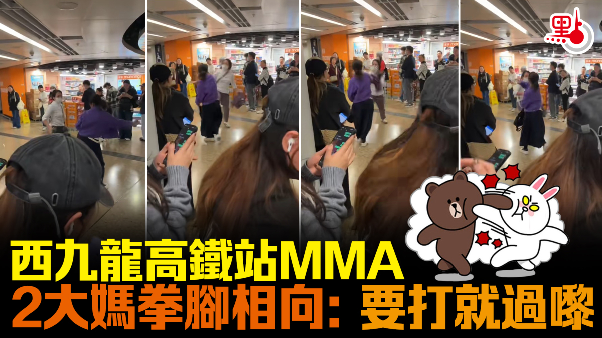 有內地網民日前在小紅書發布影片,指在西九龍高鐵站排隊買票區域發生排隊衝突。從其上載的約10秒的影片顯示,一名白衣大媽與紫衣大媽在路中心激烈爭執,拿着外套的白衣大媽率先揮拳攻擊,紫衣大媽被推開後退數步。其間聽到有女聲質問「你做咩啊?」,但兩人並未因此停手。紫衣大媽其後出腳踢向白衣大媽,白衣大媽同樣以腳回擊並喝斥「你仲打?」。紫衣大媽繼續進攻,想拍打對方頭部,白衣大媽伸手擋開並連環反擊,同時傳出「要打就過嚟囉!」。雙方經過一輪纏鬥後,紫衣大媽收手並準備離開現場,但白衣大媽立即追上前去喝斥「邊個黐線?邊個黐線啊!」。