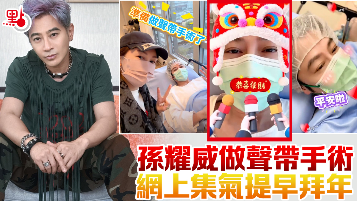 【點新聞報道】歌手孫耀威(Eric)多年來飽受聲帶出血兼鼻有粉瘤困擾,一度被醫生下令不可再唱歌,為此他曾四出尋求中西合璧診治良方外,更即時停工養聲,病情亦一路好轉,惟前日(11日)他突然在社交網上載入院做手術的短片,並說:「為我加油禱告好嗎?」由於手術後14天不能說話,他躺在手術床上,用沙啞聲音說「恭喜發財」,太太大笑,並配上過年氣氛的歌曲當背景音樂,十分喜慶。
