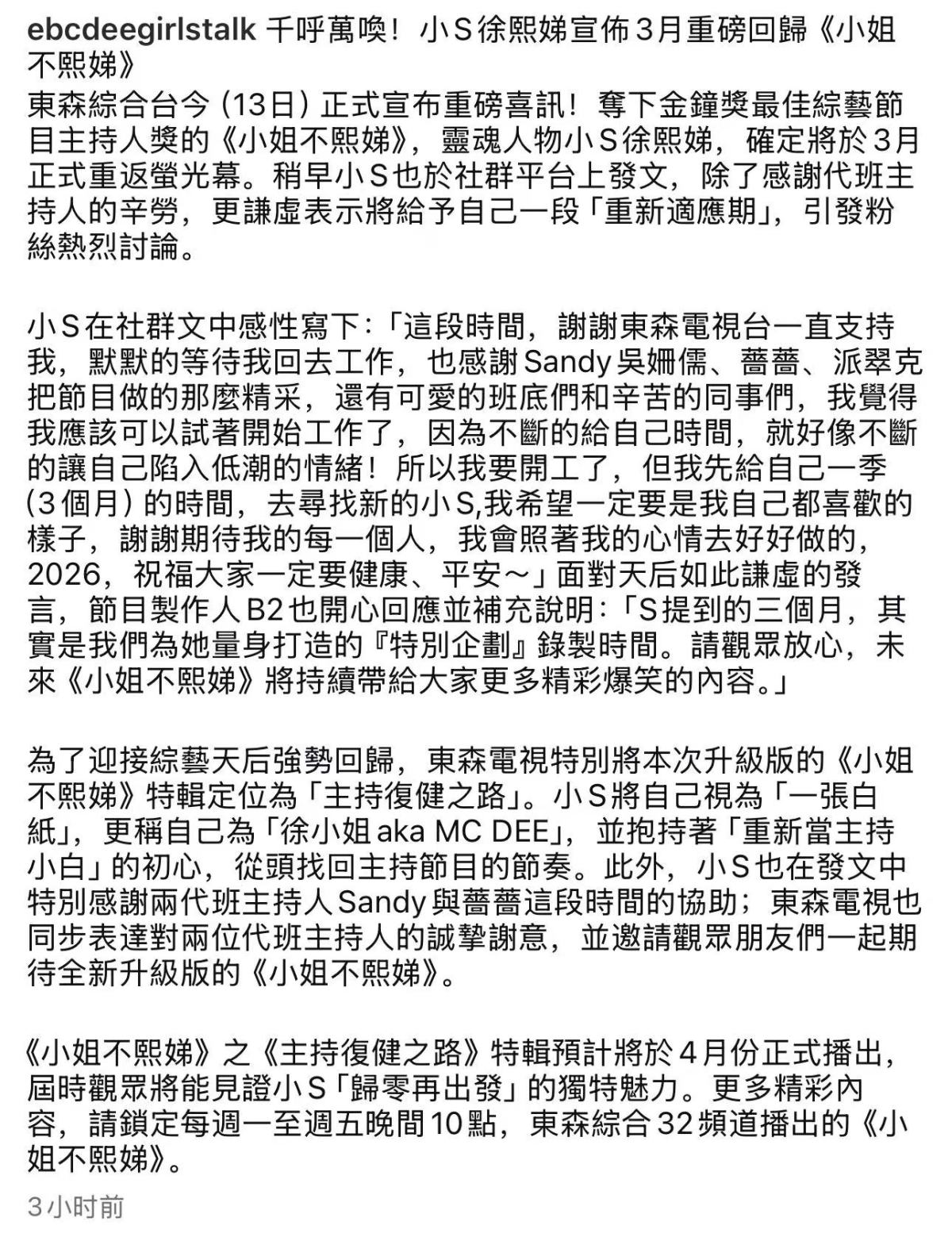 小S在社群文中感性寫下「這段時間,謝謝東森電視台一直支持我,默默的等待我回去工作,也感謝Sandy吳姍儒、薔薔、派翠克把節目做的那麼精彩,還有可愛的班底們和辛苦的同事們。我覺得我應該可以試着開始工作了,因為不斷的給自己時間,就好像不斷的讓自己陷入低潮的情緒!所以我要開工了,但我先給自己一季(3個月)的時間,去尋找新的小S,我希望一定要是我自己都喜歡的樣子,謝謝期待我的每一個人,我會照着我的心情去好好做的。2026,祝福大家一定要健康、平安~」