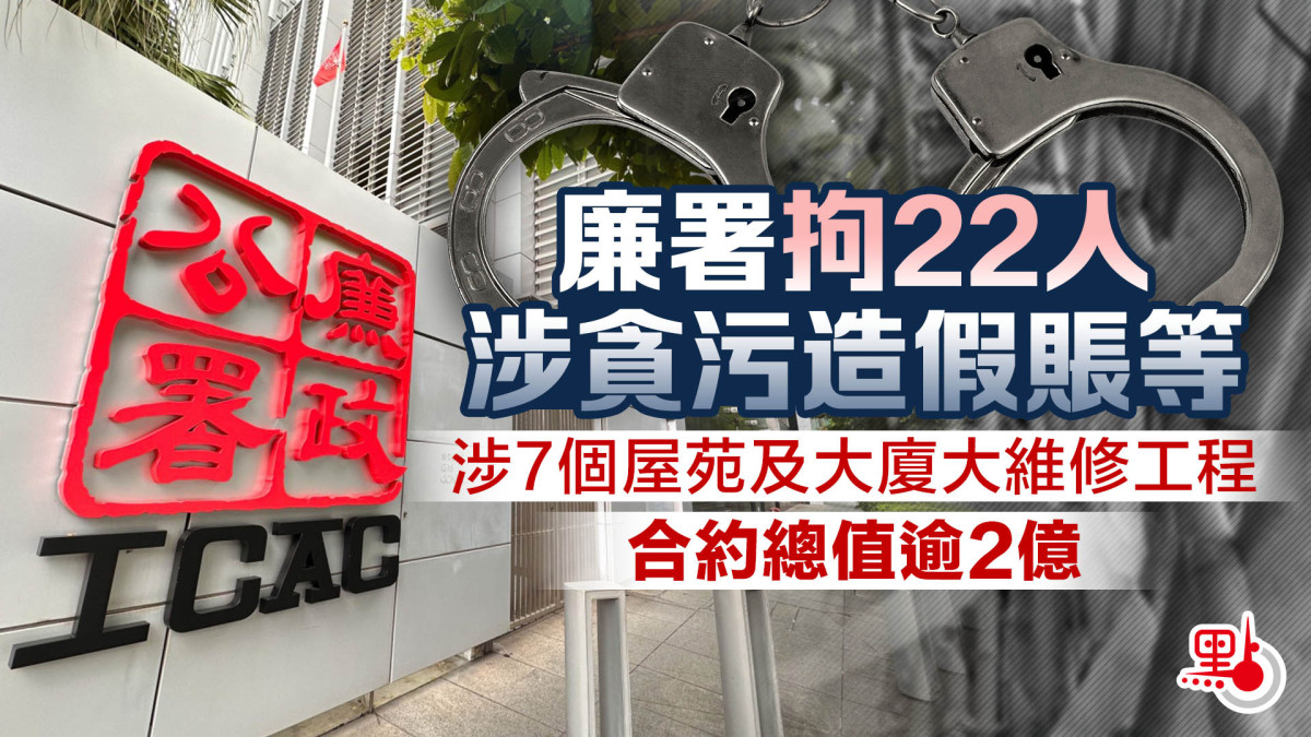 【點新聞報道】廉政公署2月9日及10日採取代號為「獅子山」的執法行動,打擊樓宇大維修工程涉嫌貪污及相關違法行為,涉及全港多區7個屋苑及大廈,拘捕共22名人士。被捕人士分別為17名男子及5名女子,年齡介乎36至78歲,包括4間工程顧問公司及3間工程承辦商的董事及職員,以及部分屋苑及大廈的業主立案法團(法團)主席。相關貪污調查仍在進行,廉署不排除再有進一步執法行動。