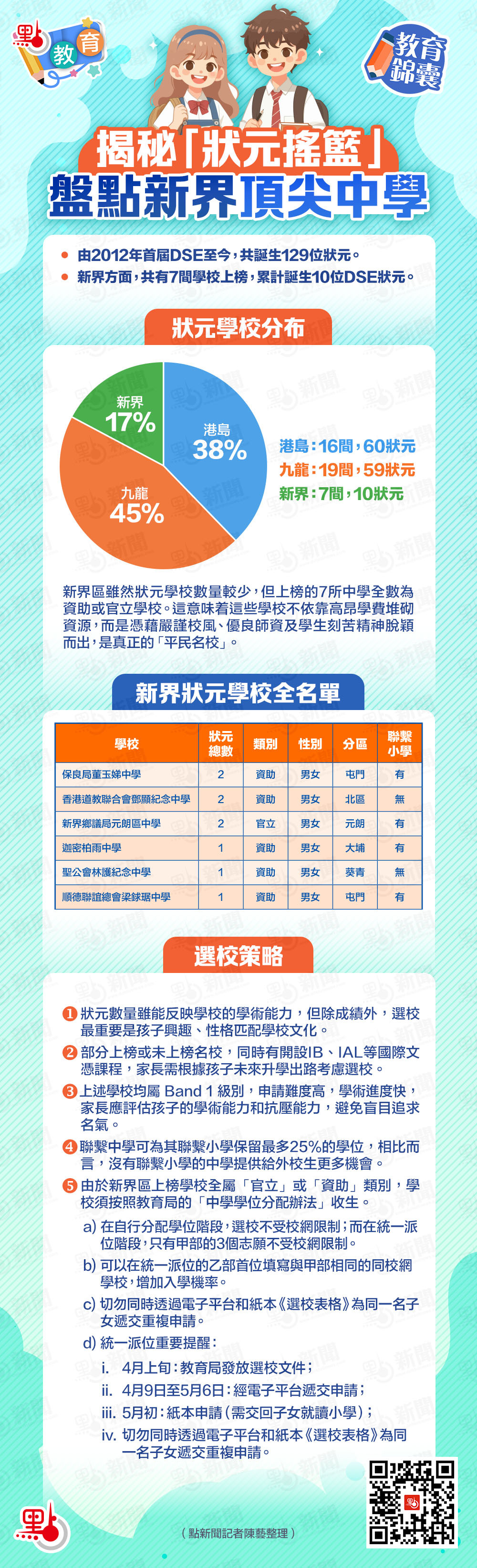 【點新聞報道】自2012年首屆DSE開考至今,全港共誕生129位狀元,分別來自43所學校。點教育特別分3期盤點港島、九龍和新界的「狀元搖籃」,助各位家長和小升初同學們參考中學選校。